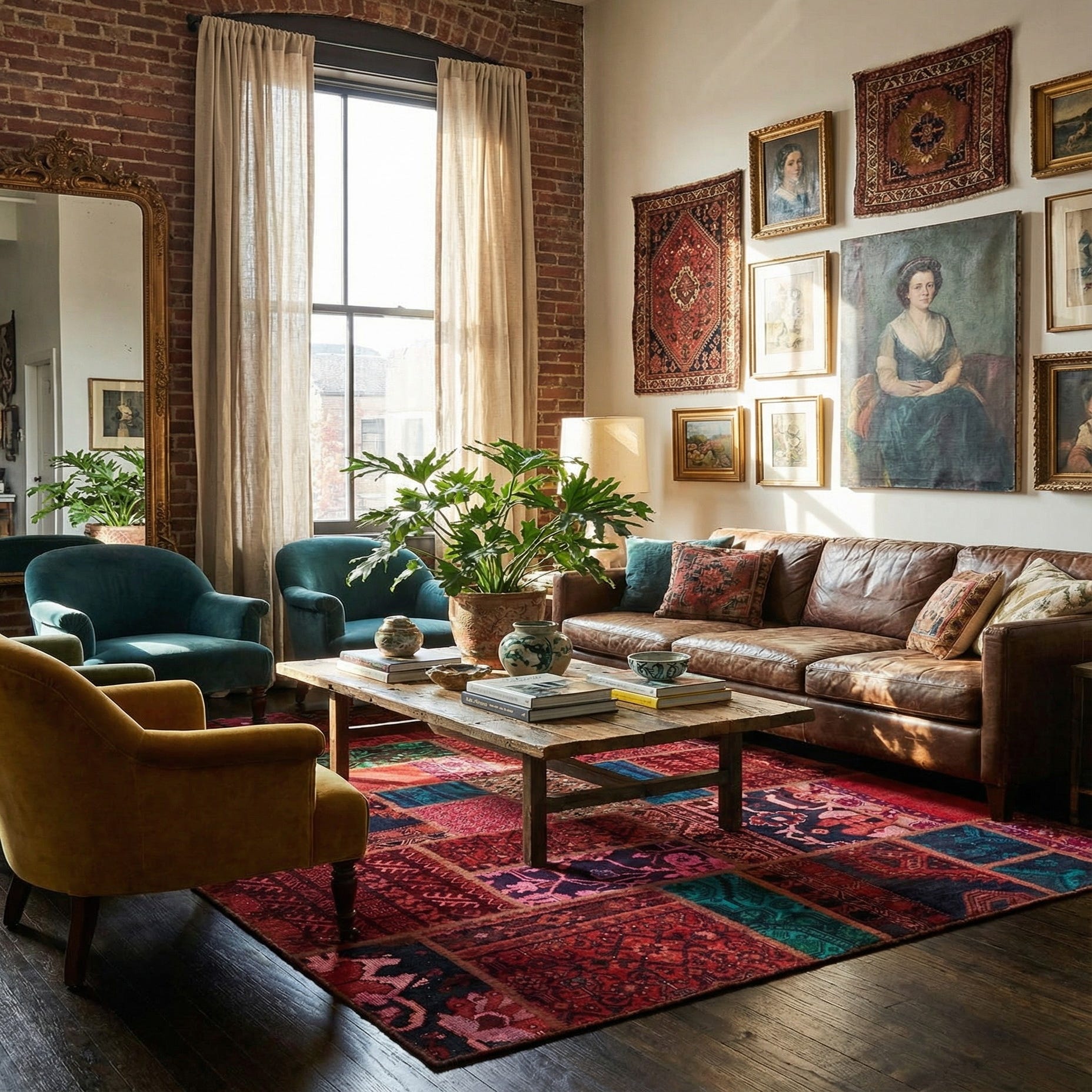 This piece works well as a focal anchor in an eclectic or bohemian living room, bringing color and pattern to neutral sofas and warm wood floors. It also complements a vintage-inspired dining area or a study with leather seating and brass accents, where the rich tones add depth. In contemporary spaces, place it under a simple coffee table or use it to introduce color and texture against clean-lined furniture and muted walls.