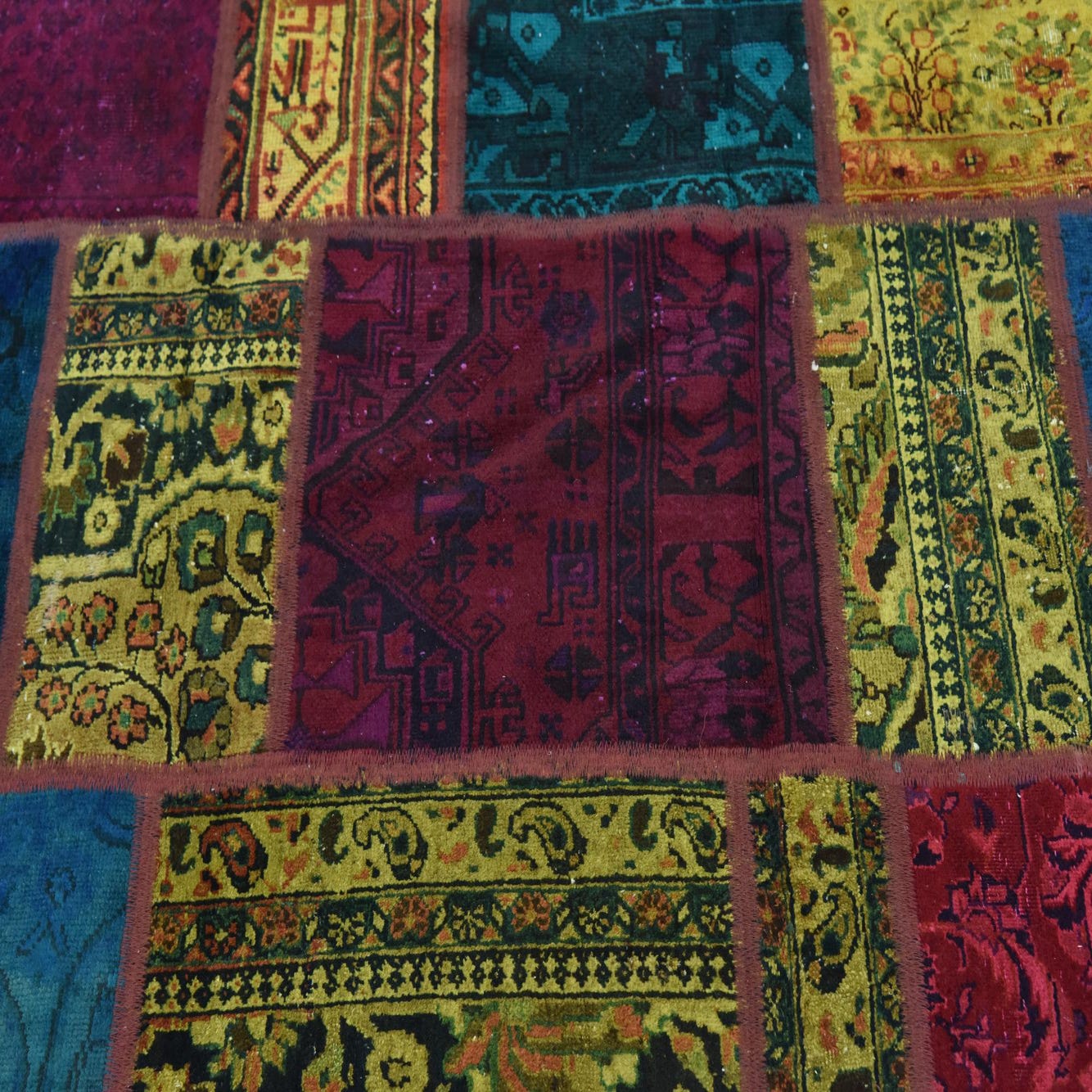 This hand-knotted Ultra Vintage collection rug presents a captivating patchwork design that showcases a rich tapestry of geometric and floral motifs. The striking pattern is rendered in a diverse palette that includes beige, black, blue, brown, green, ivory, navy blue, olive, orange, pink, yellow, red, and purple on a multi-colored background. Each panel expresses a unique aesthetic, contributing to an overall look that is both dynamic and harmonious.