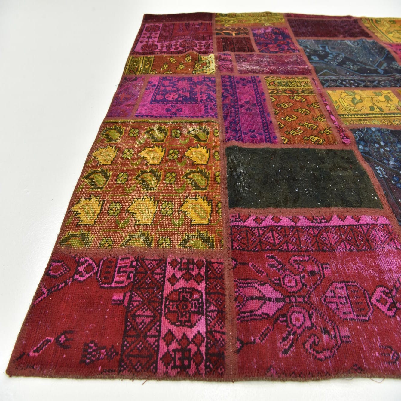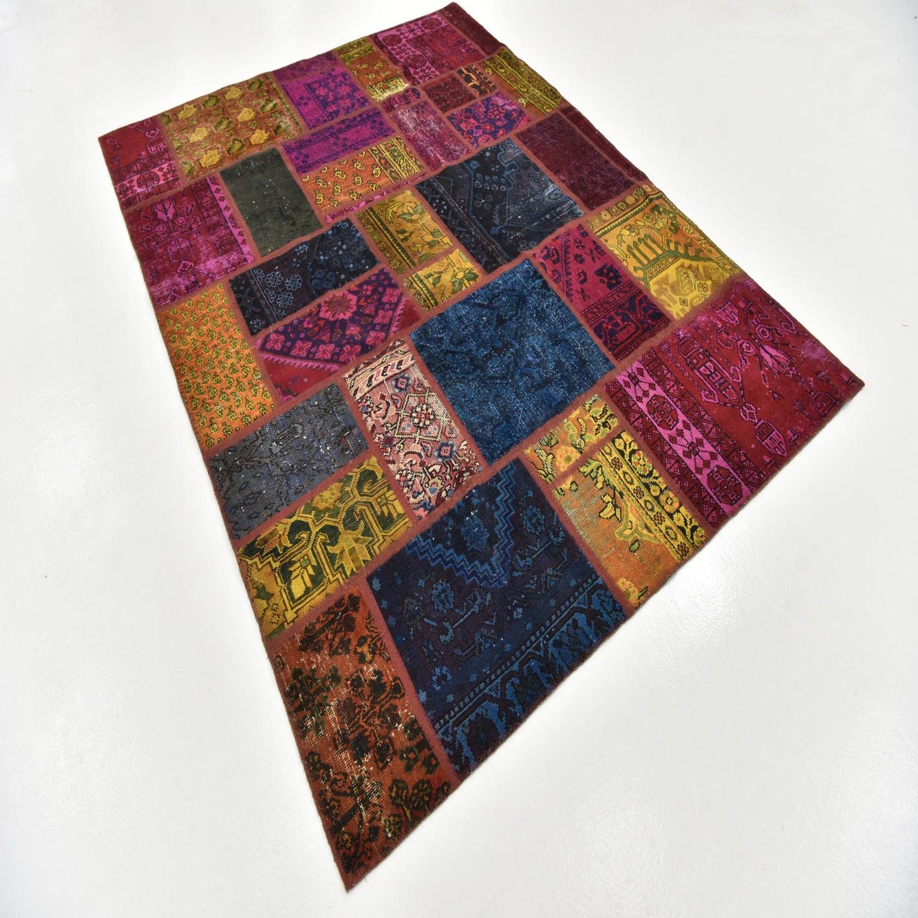 A 6x9 rectangular multi-colored patchwork rug featuring various Persian, modern, and vintage patterns in vibrant hues of red, blue, yellow, and fuchsia, ideal for a living room.