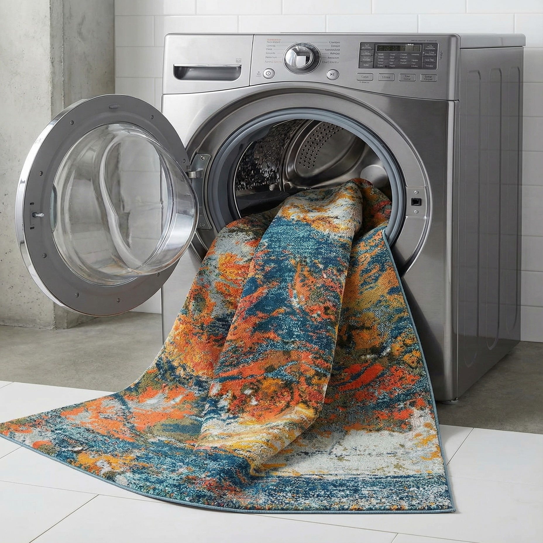 This vibrant piece brings color and movement to contemporary and transitional rooms alike. It works well anchoring a seating area or under a coffee table to add a focal point, or layered over wood floors to introduce contrast and texture. Pair it with navy or neutral upholstery for a coordinated look, or use it in eclectic, bohemian, or coastal-inspired interiors where its mix of cool blues and warm tones will tie varied elements together.