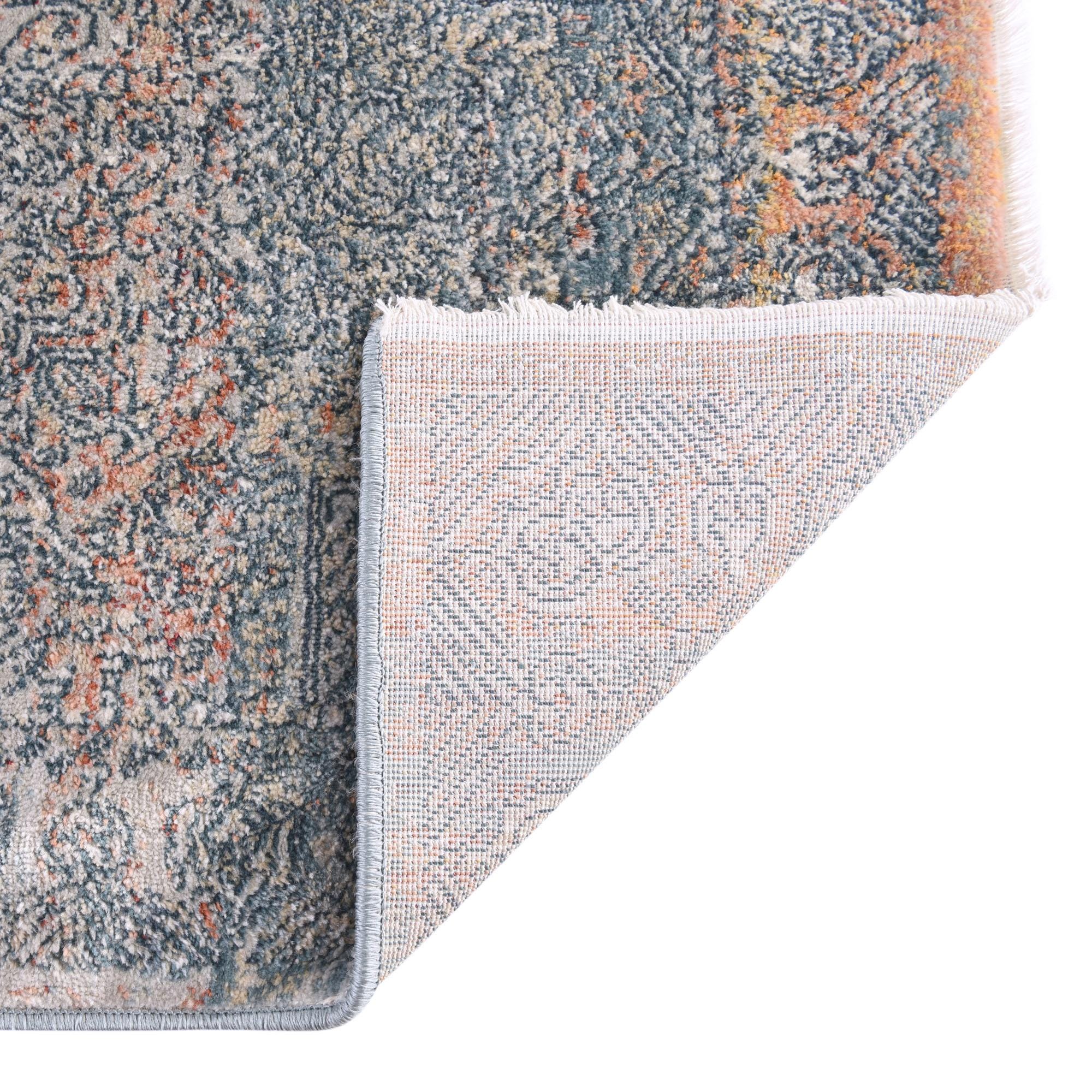 Primary color is Multi. Colors in this rug include: Multi, Ivory, Light Blue, Light Salmon, Rust Red, Terracotta.