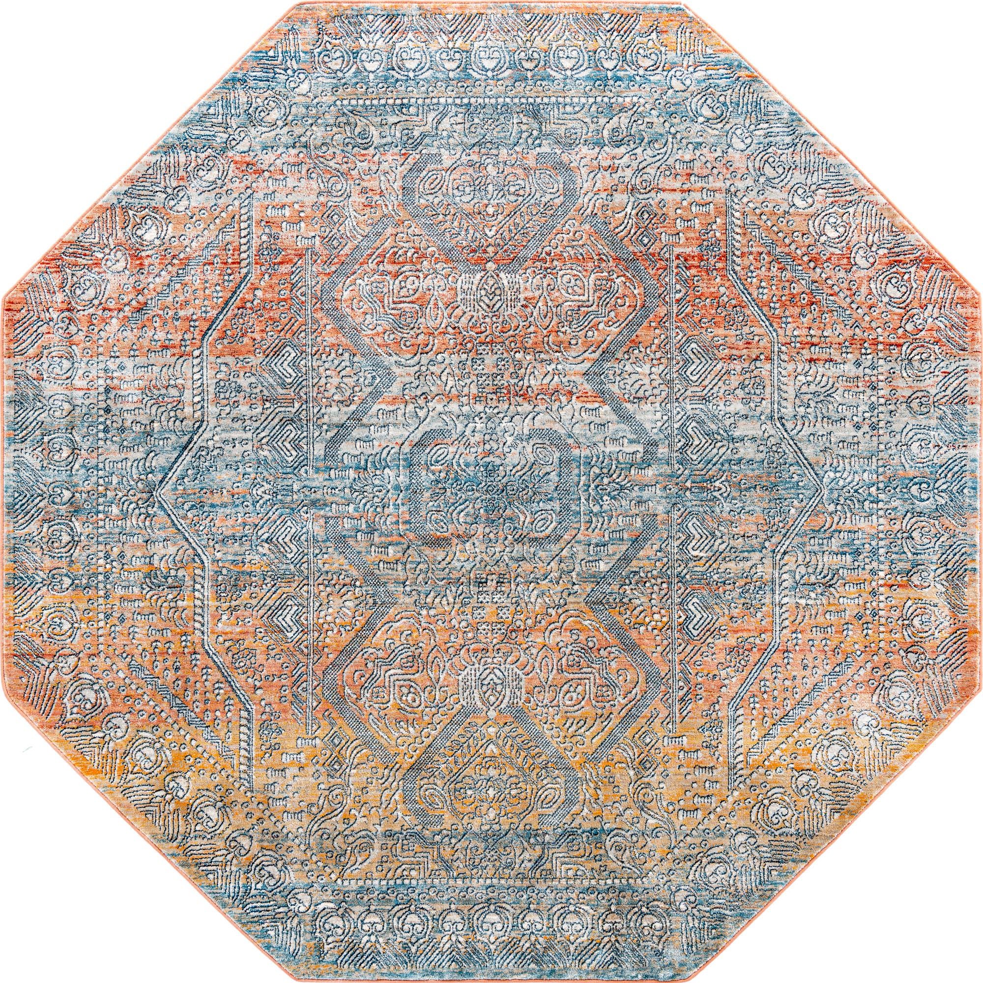An octagonal rug with a vintage-inspired medallion layout and an allover, slightly distressed field. Intricate floral and geometric motifs weave through the design, with fine linear details forming a central medallion and stepped corner elements that give the piece a layered, handcrafted look. The background is Multi, complemented by pops of Ivory, Light Blue, Light Salmon, Rust Red, and Terracotta that blend into a balanced, sun-faded palette.