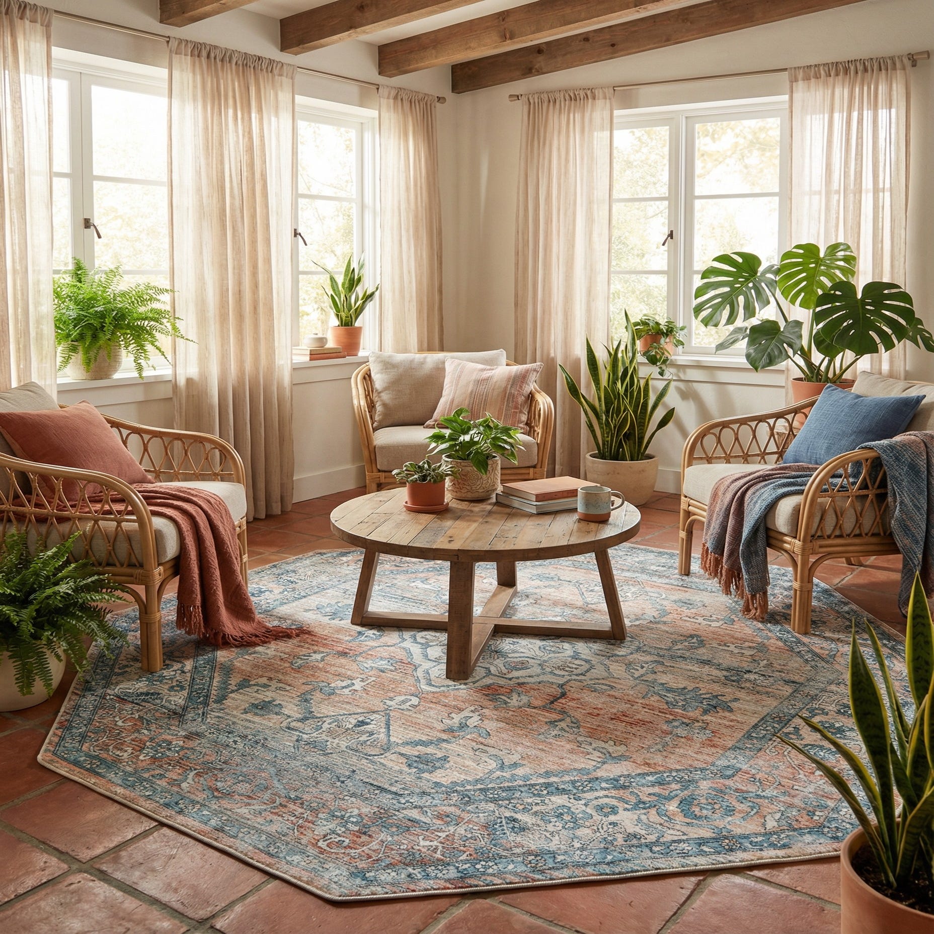 A classic medallion design gets a relaxed, vintage-inspired update in this octagonal rug. The multi background carries layered washes of blue, light blue, gray and ivory that mingle with warm accents of light brown, terracotta, rust red and red, while scrolling vines and floral motifs radiate from the central medallion into a decorative outer border. The distressed finish softens the pattern edges for an aged look that still reads detailed and intentional.