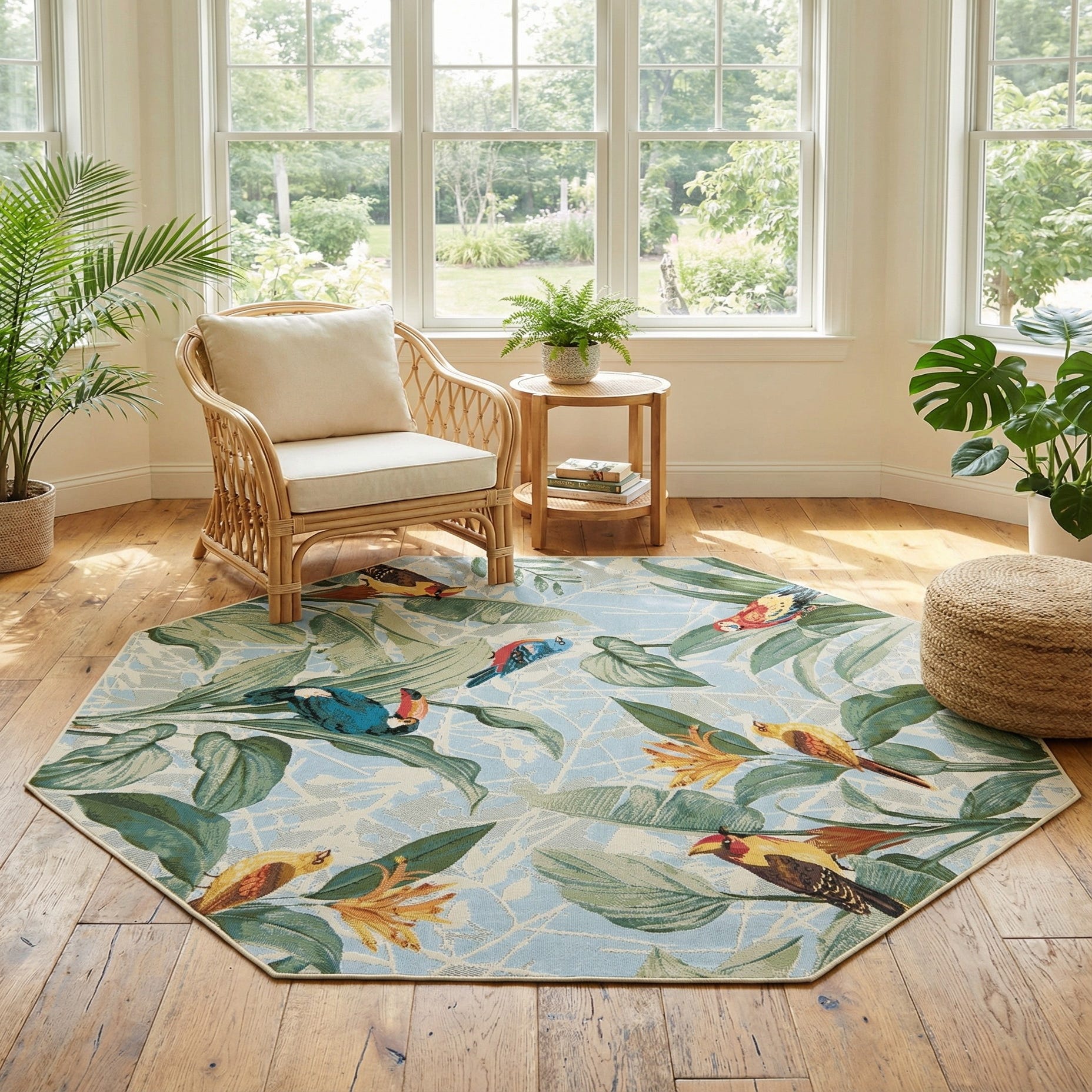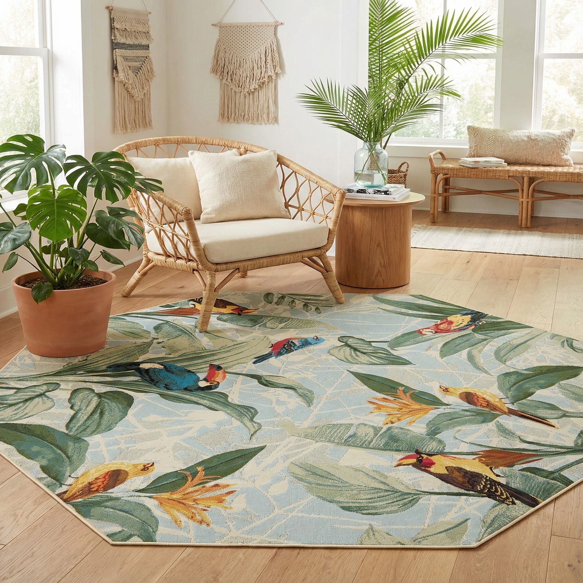 Octagon rug with a vibrant botanical pattern featuring tropical birds, toucans, and large green leaves on a light blue background.