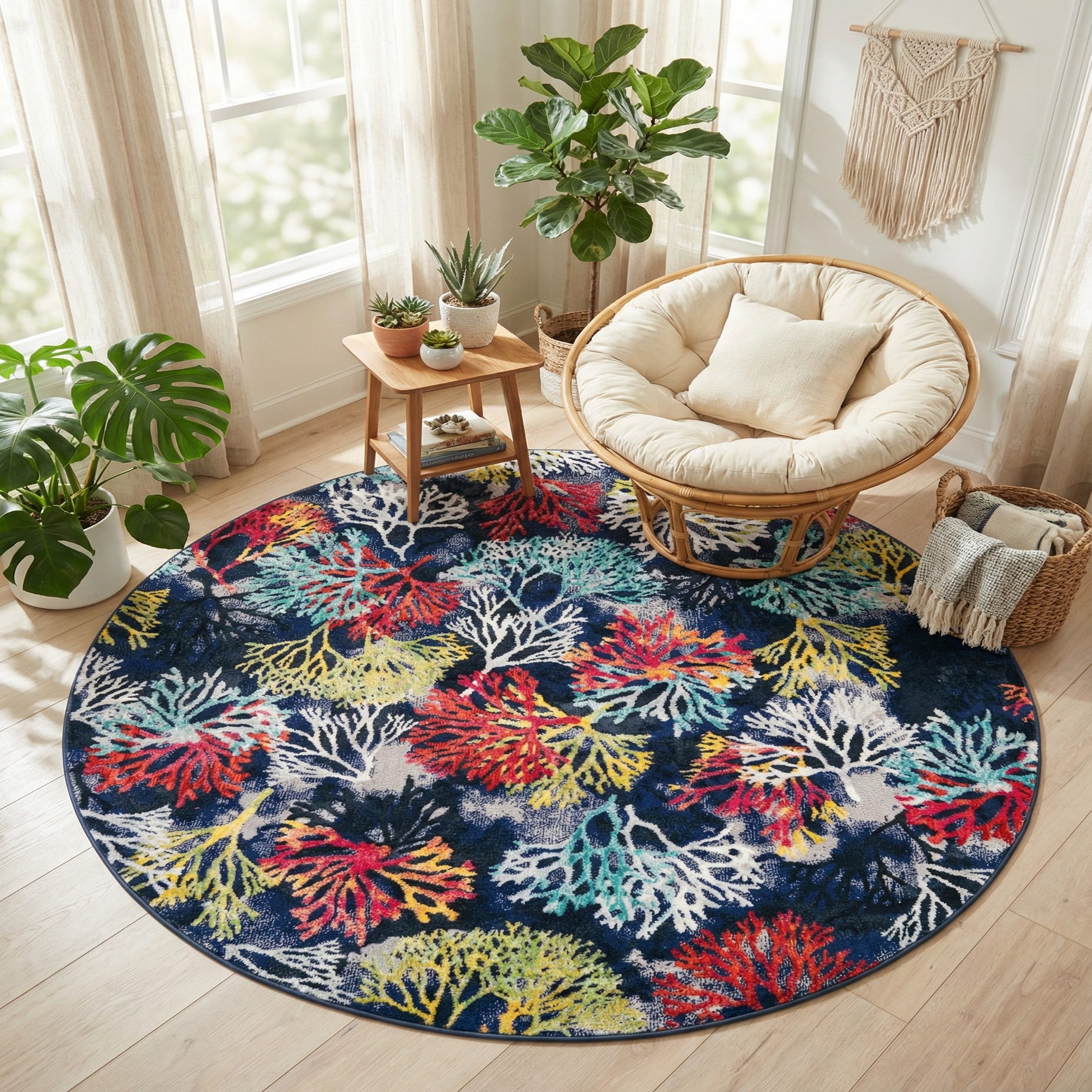 A lively coral-and-seaweed pattern fills the round field, rendered in branching organic forms that layer across a multi-tonal background. Navy and deep gray provide depth while pops of red, yellow, pink, light blue, green and ivory bring energy to the design. Black accents add contrast and help define the delicate, radiating shapes for a contemporary coastal look that also works in eclectic or modern interiors.