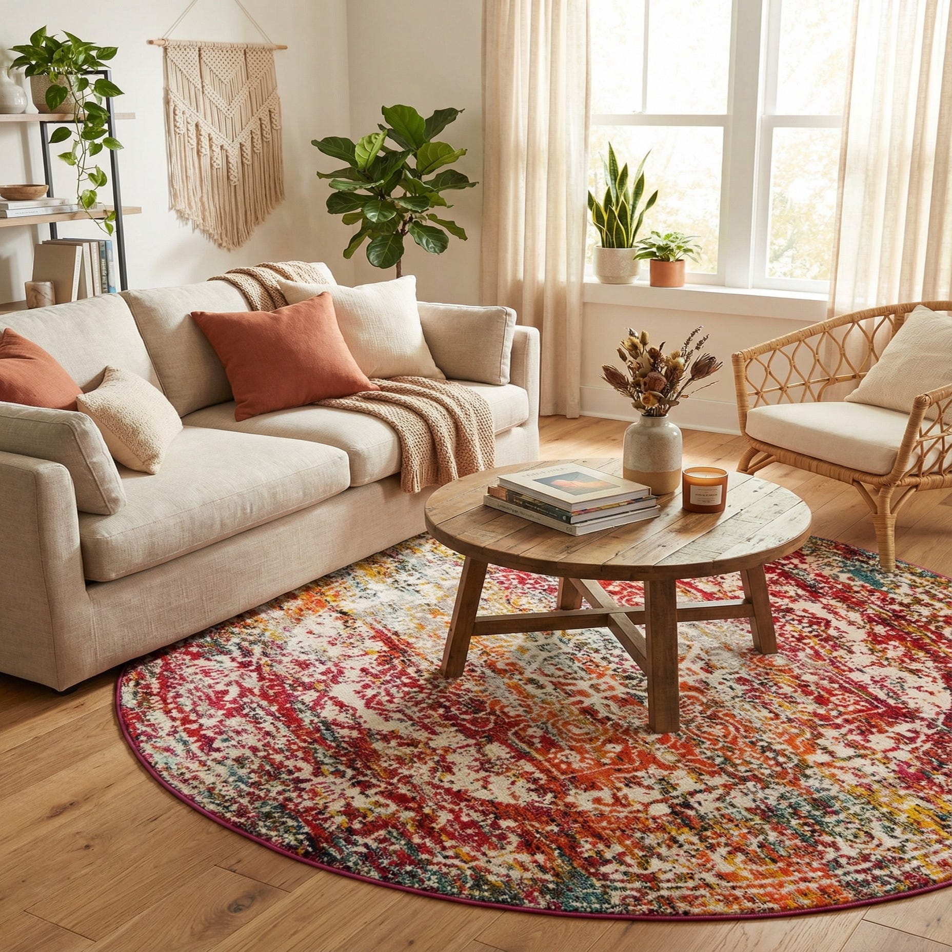 This rug works well as an anchor for a round dining table, a cozy seating cluster in a living room, or a warm layer at the foot of a bed. The vibrant color mix pairs easily with warm wood tones and neutral upholstery, and it complements modern bohemian, eclectic, or transitional interiors—use simple black metal accents or natural linens to let the pattern stand out, or coordinate with jewel-toned pillows and artwork for a bolder look.