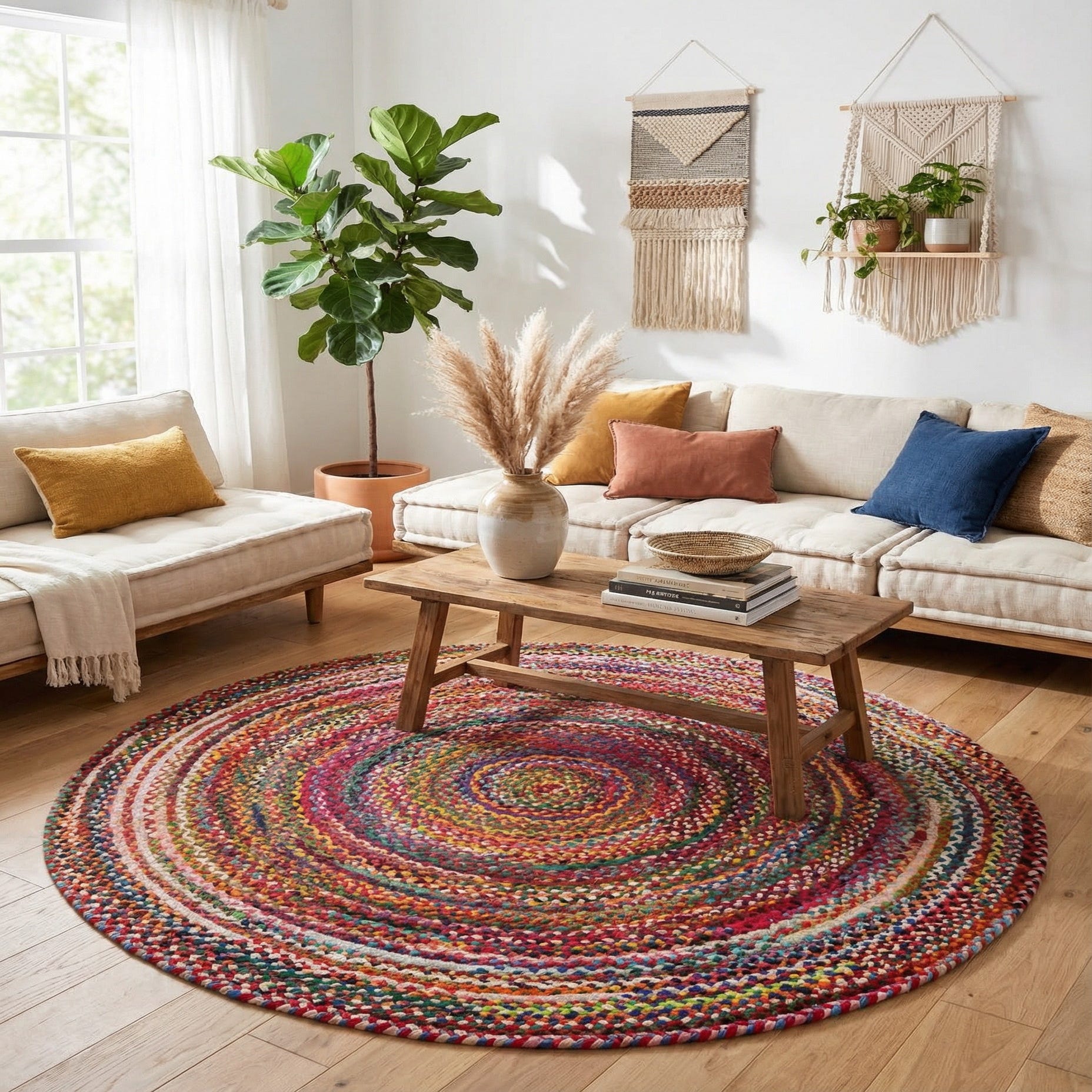 Place it beneath a coffee table to add color to a living area, set it in a breakfast nook to warm up a casual dining spot, or use it to define a play area or entryway. It pairs nicely with neutral upholstery, natural wood furniture, and layered textiles, and works well in eclectic, bohemian, cottage, or casual contemporary interiors where a multicolored, handmade look complements the room.