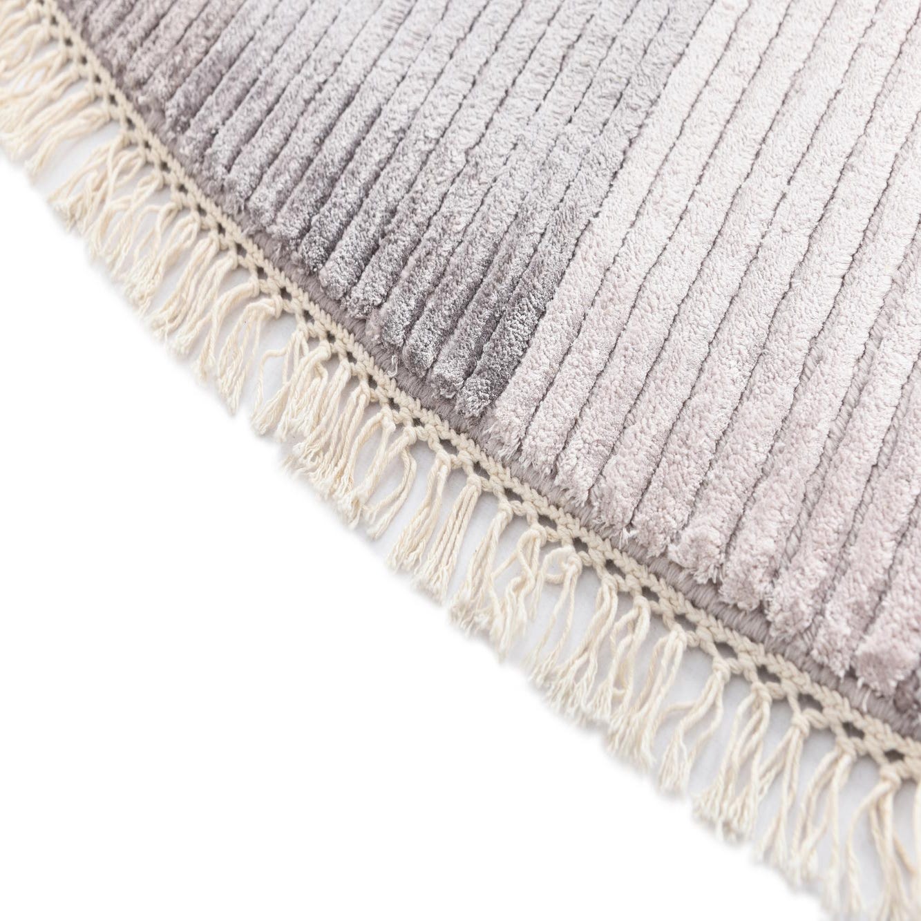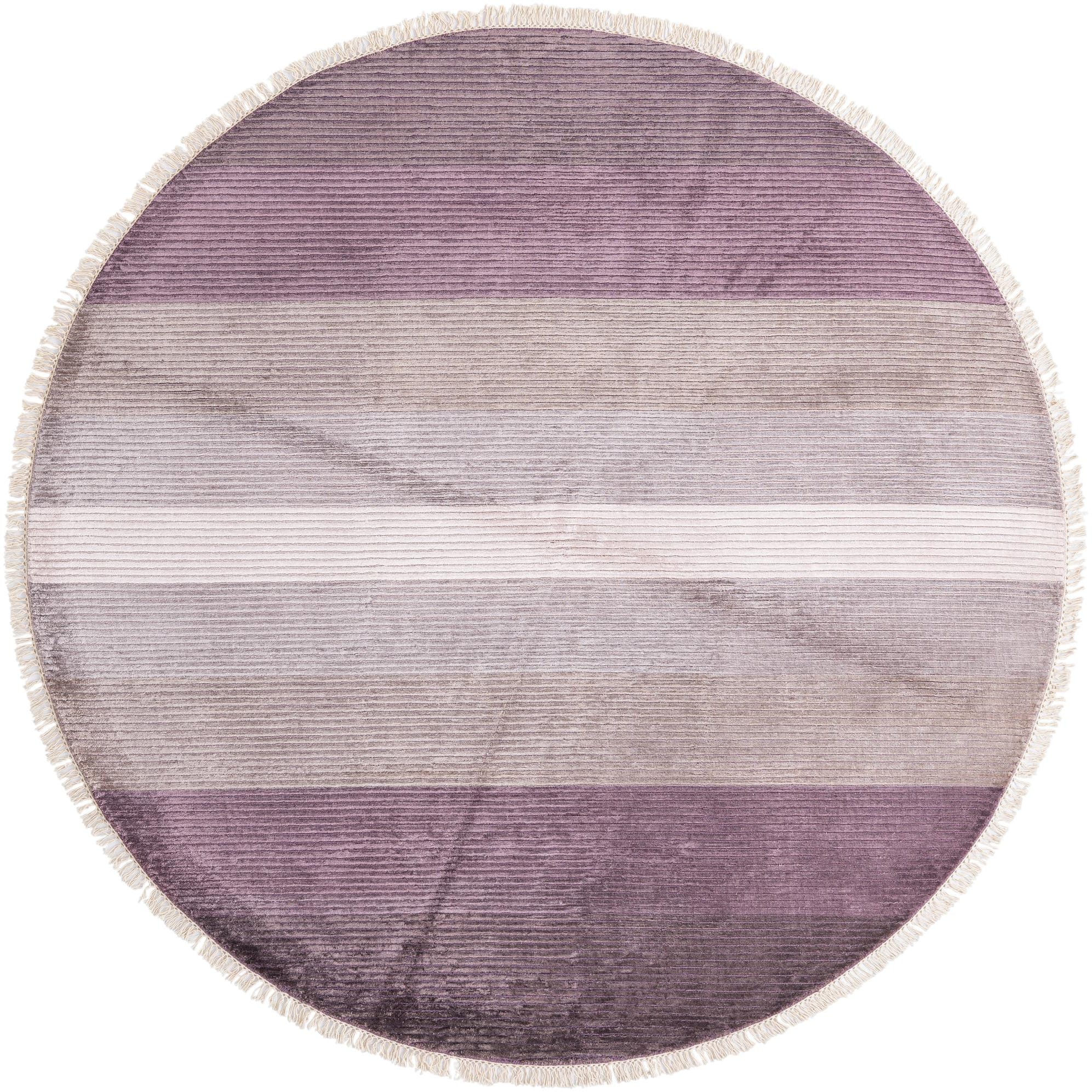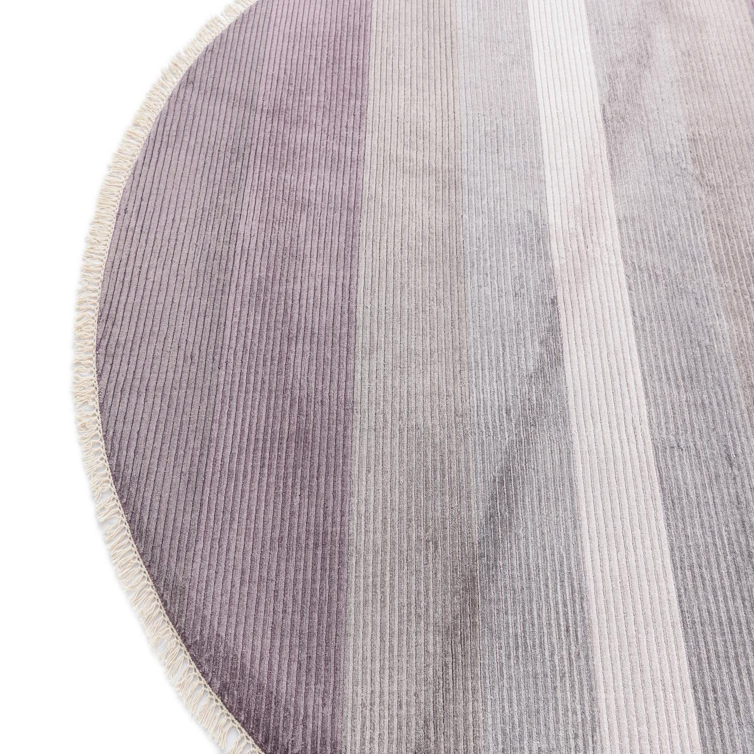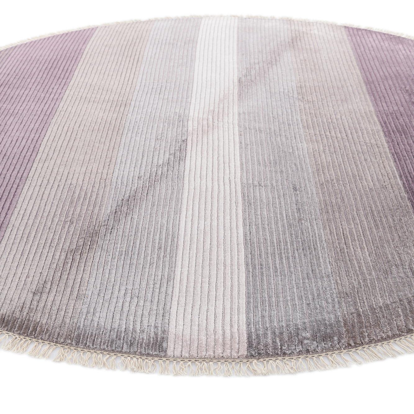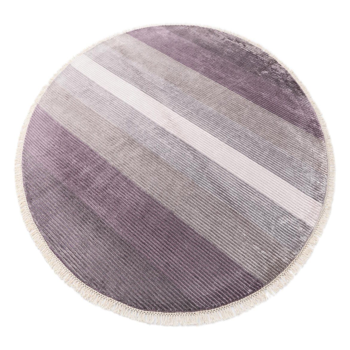 A round, multi-colored wool rug with horizontal stripes in shades of purple, grey, and white, featuring a fringed edge.