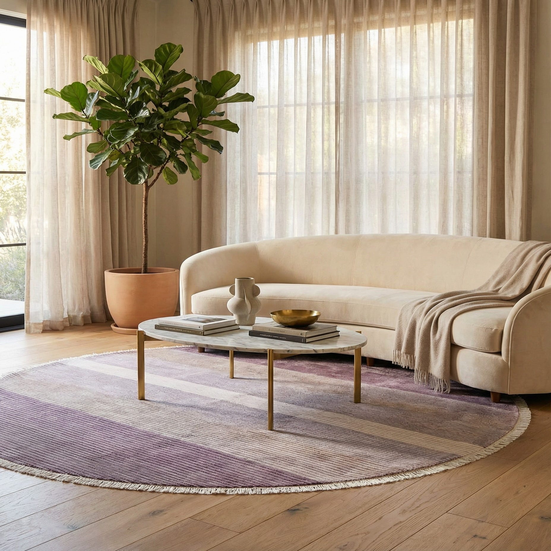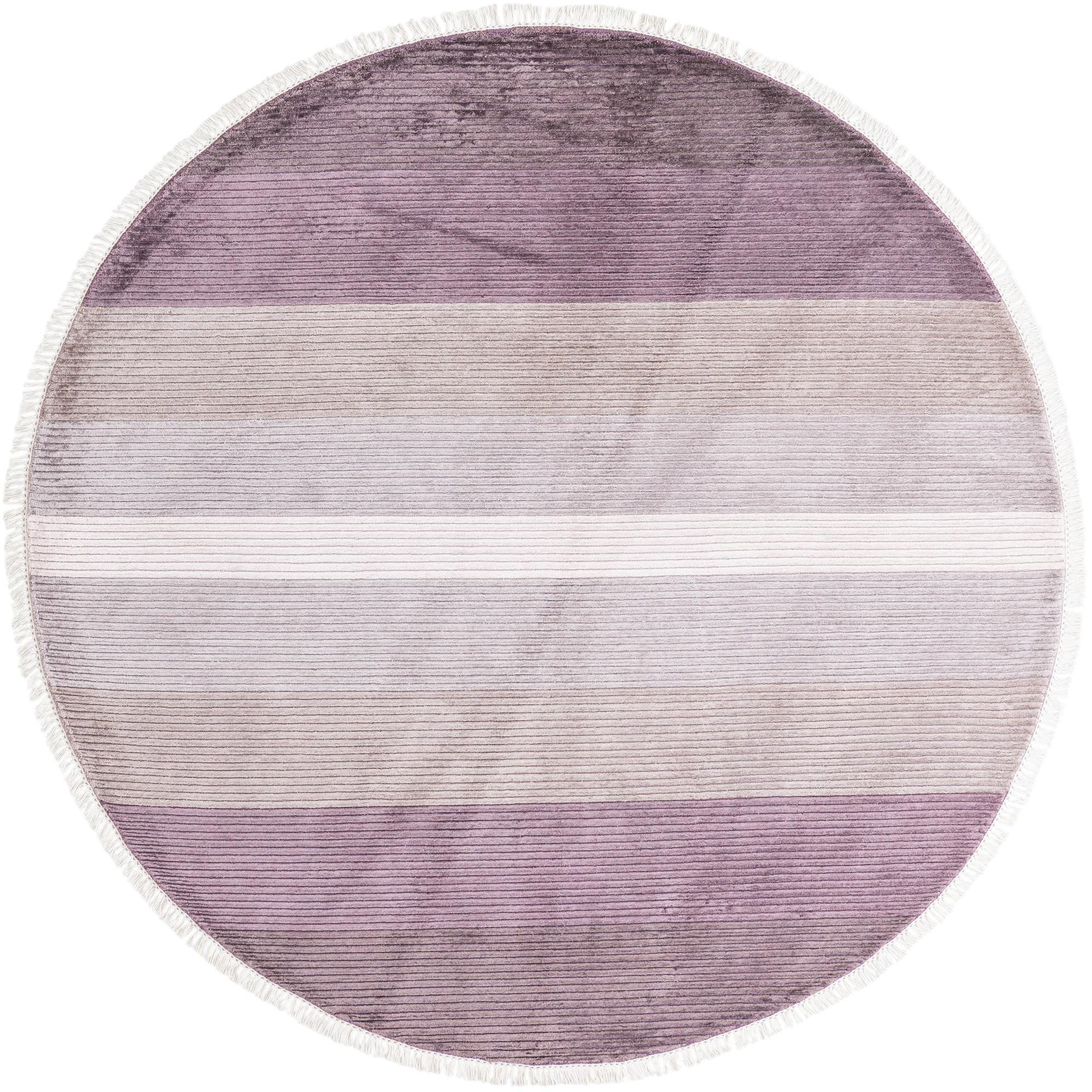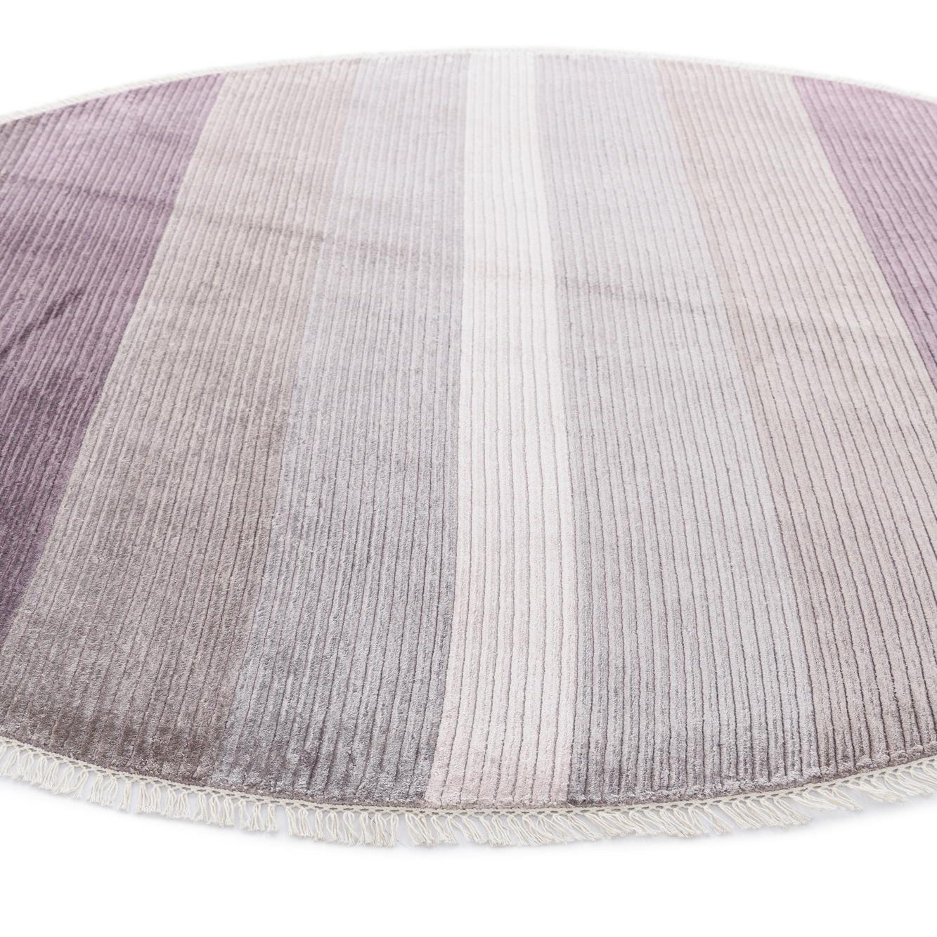 A round, multi-colored Darya rug with horizontal stripes in shades of purple, grey, and white, featuring a fringed edge.