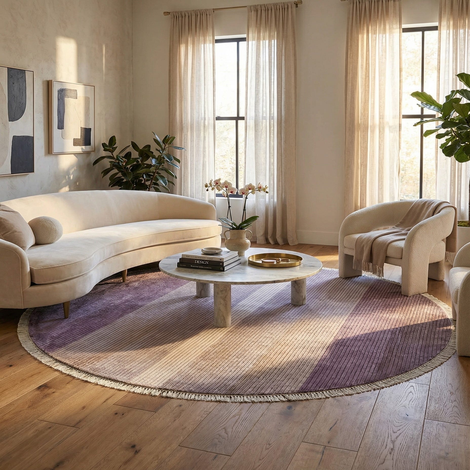 Place this rug to anchor a circular dining table or to define a cozy seating group in a living room; it also works well under a bedside chair or in a compact home office to introduce color and texture. Pair it with warm wood tones and soft grays to accentuate the purple and puce hues, or combine with mid-century and contemporary furnishings for a balanced, modern-meets-comfort aesthetic.