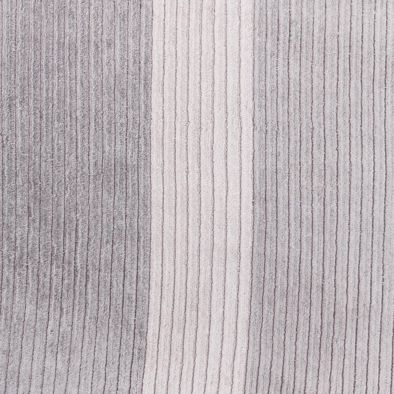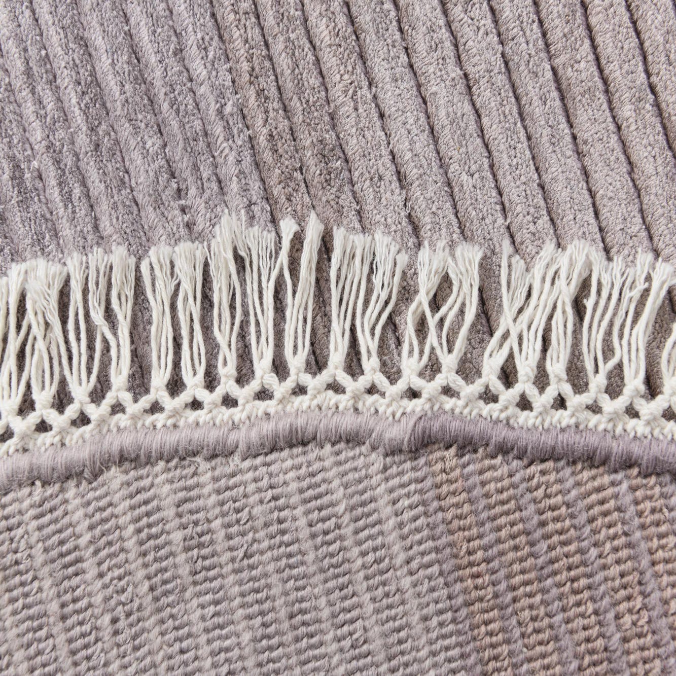 Hand-knotted of 100% wool, this round rug shows broad horizontal bands laid across a multi background—deep puce and purple anchor the top and bottom, while soft cream, gray and tan bands create a calm, layered middle. The surface has a fine, ribbed weave that catches light and gives a tactile, corduroy-like texture; a short, dense pile reads as comfortably substantial underfoot. A neat cream fringe trims the edge for a relaxed, finished look.