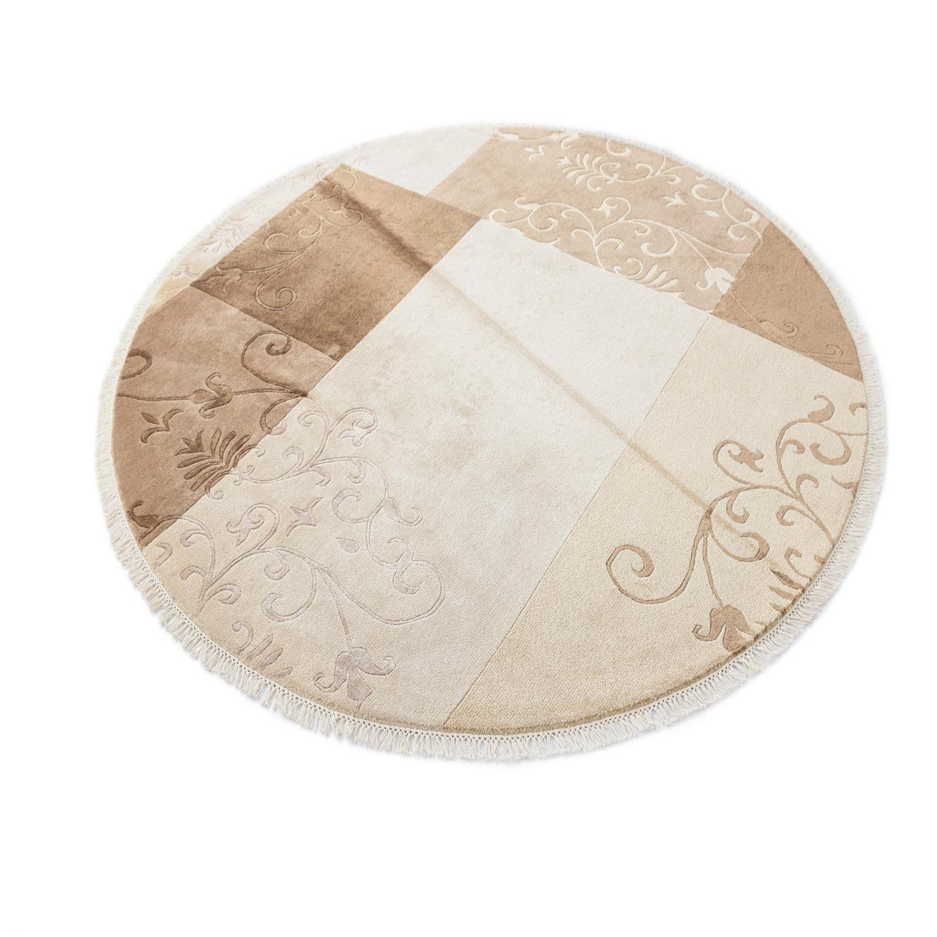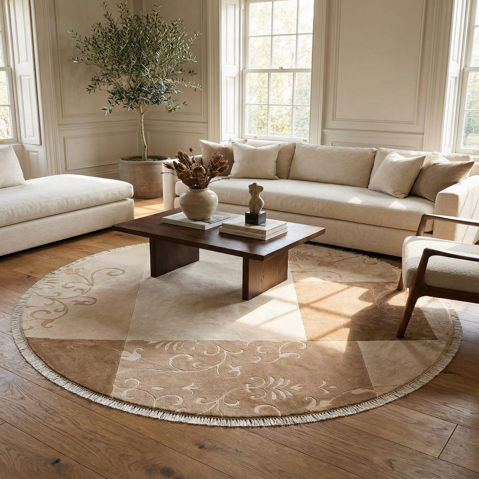 The Darya collection presents a 7 Ft Round Hand Knotted rug crafted from 100% Wool, offering a harmonious blend of earthy tones. The rug's pattern features a sophisticated patchwork design combining both solid and embellished panels. The embellishments consist of elegant scrollwork motifs that lend a subtle ornate touch to the overall aesthetic. Colors present in this piece include a versatile array of Multi, Beige, Brown, Light Brown, and Tan, set against a Multi-hued background, fostering a warm and inviting atmosphere in any space.