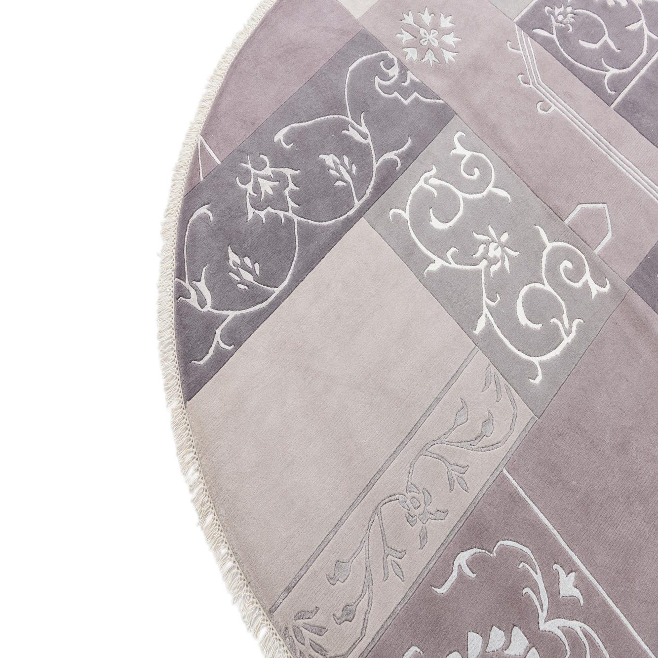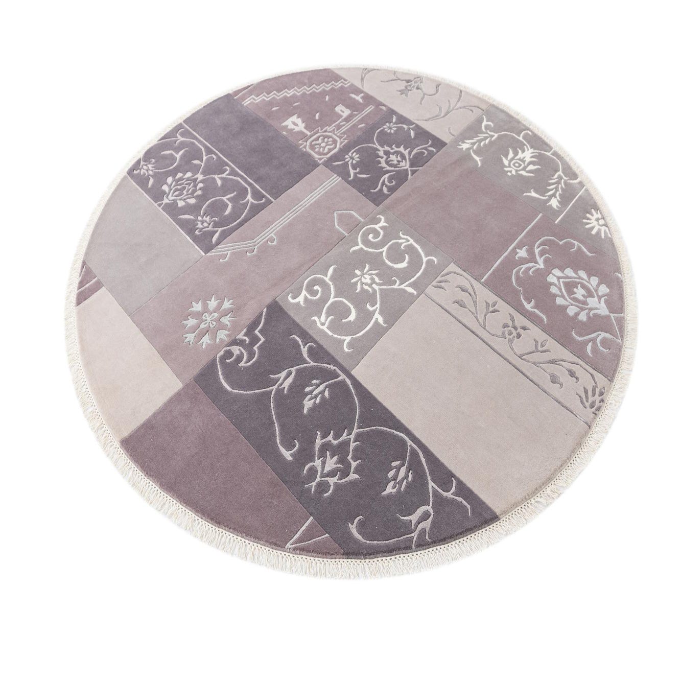 A 6' 7 round multi-colored wool rug with a modern oriental patchwork design in shades of purple, beige, and gray, featuring intricate floral and geometric patterns.