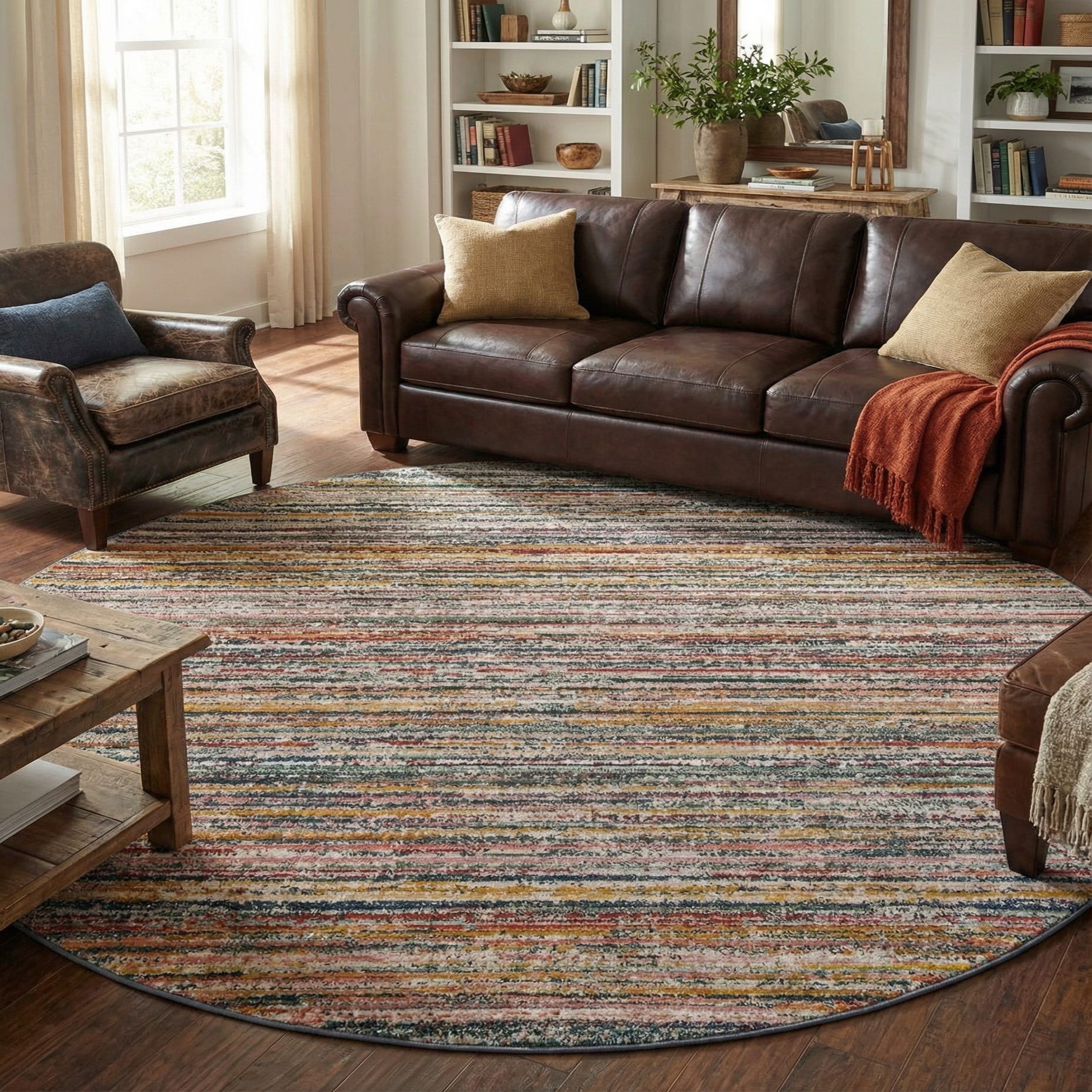 This piece pairs well with a range of interiors. Place it under a round dining table to define the seating area, use it beneath a coffee table to add color and movement to a neutral living room, or set it in an entryway or casual seating nook where the layered stripes can complement wood tones, linen upholstery, or brass accents. Its color variety makes it easy to coordinate with both modern and eclectic schemes, and it can be layered over a natural fiber rug for added depth and texture.