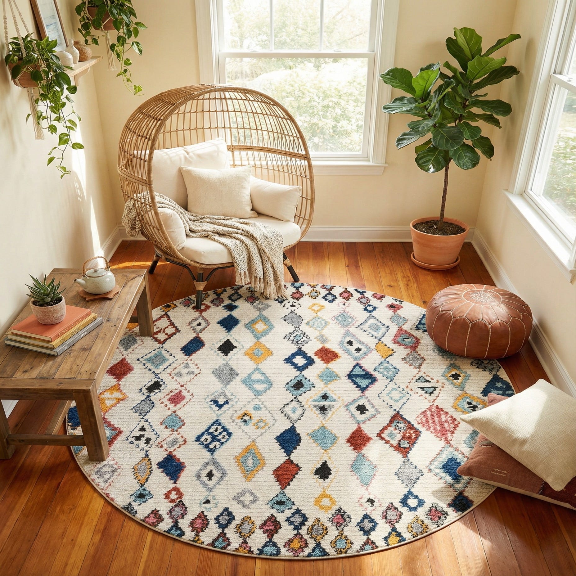 Machine-made from 100% polyester, the surface feels soft underfoot with a low-to-medium pile that holds color and texture well. Place this round rug in a casual living area beneath a coffee table to anchor seating, layer it in a bedroom to add warmth at the foot of the bed, or use it in an entryway to introduce pattern and color. It pairs easily with warm woods, neutral upholstery, woven textures and matte metal accents, and complements bohemian, transitional, and eclectic interiors.