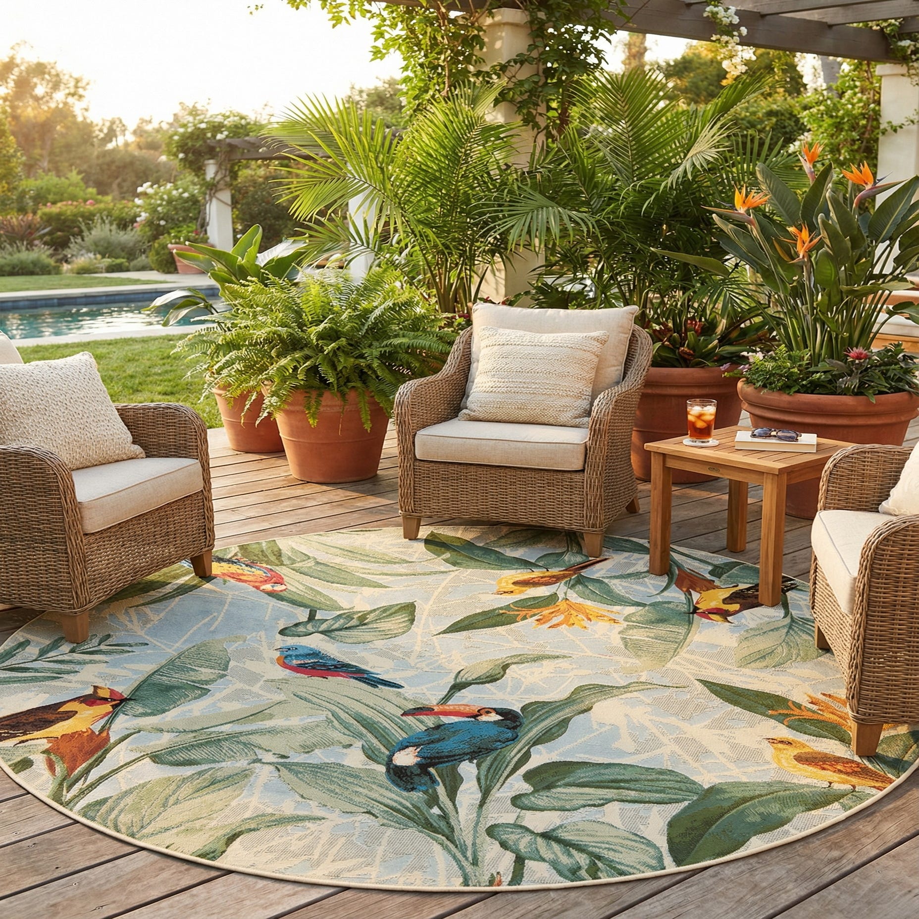 From the Outdoor Botanical collection, this 7 Ft Round rug presents a vibrant tableau of nature's splendor. Machine woven from 100% polypropylene, the rug features an elaborate display of flora and fauna, with vivid depictions of various bird species perched amidst lush foliage. The background is a harmonious mix of colors that encapsulates the palette of the great outdoors with hues of black, blue, brown, gray, green, ivory, light blue, light green, red, rust red, yellow, and navy blue, creating a dynamic and inviting scene.