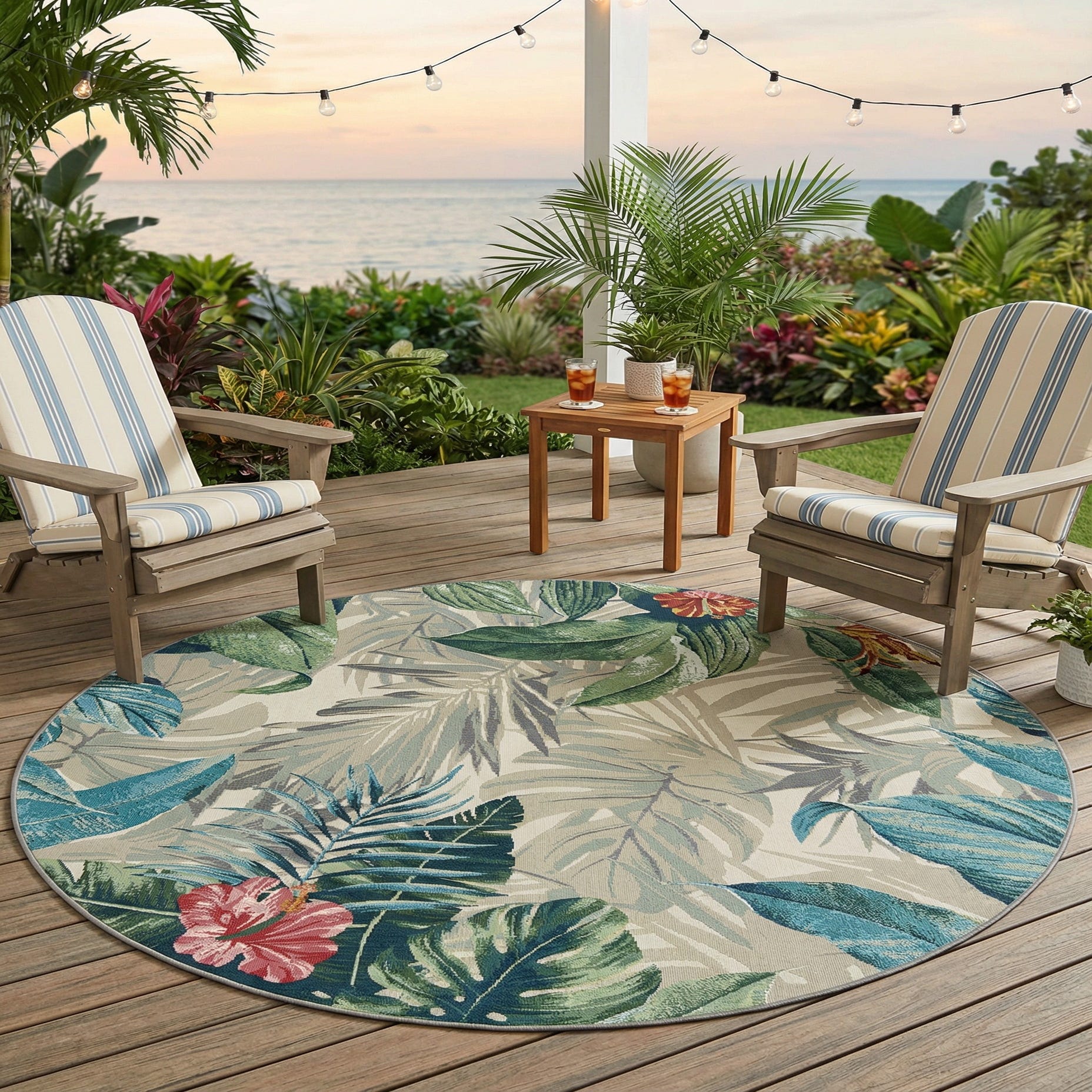 This round piece works well on a covered patio, screened porch, sunroom or beneath a round dining or bistro set, and it pairs naturally with rattan or teak seating, coastal linens, or neutral outdoor furniture with navy or rust accent pillows. Use it to anchor a tropical-inspired living area or to bring botanical interest to a modern outdoor dining space; the mix of muted and vivid tones makes it easy to coordinate with both natural woods and painted furniture.