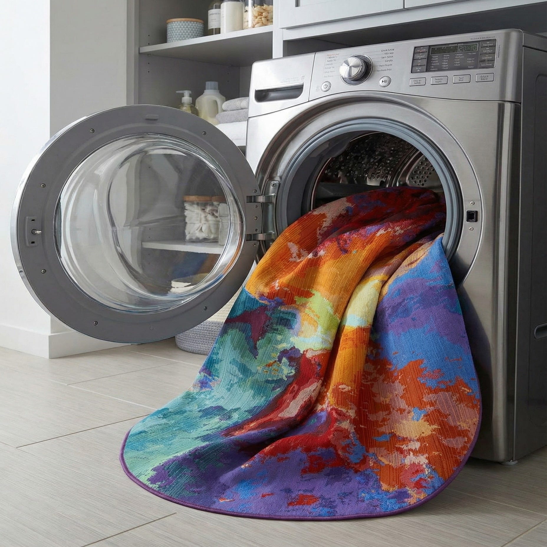 A vibrant 7' round multi-colored abstract rug with splashes of orange, red, blue, purple, and green, suitable for a patio.