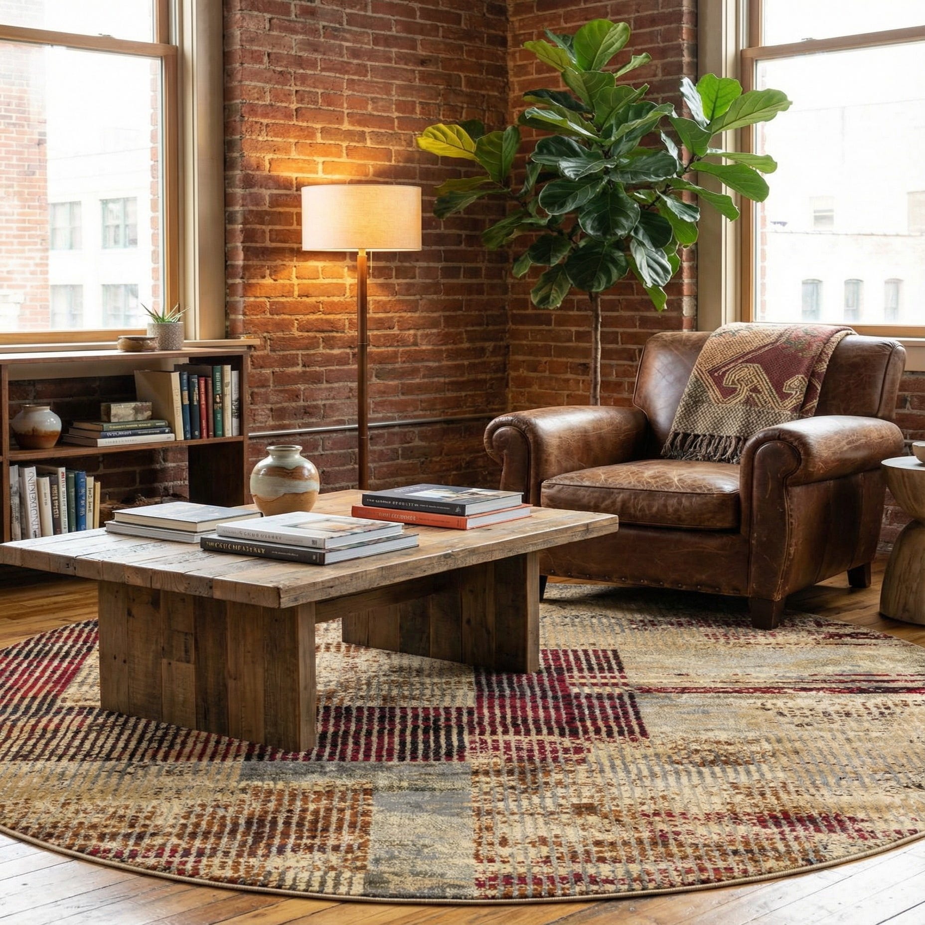 The colorway and modern distressed pattern suit a range of interiors — place it beneath a round coffee table to anchor a seating area, set it in a breakfast nook to soften hard floors, or use it under a dining set to introduce pattern without overwhelming the space. It pairs naturally with leather or wood furniture and metal accents, and the burgundy and blue highlights offer easy coordination points for throw pillows, artwork, or accent pieces.