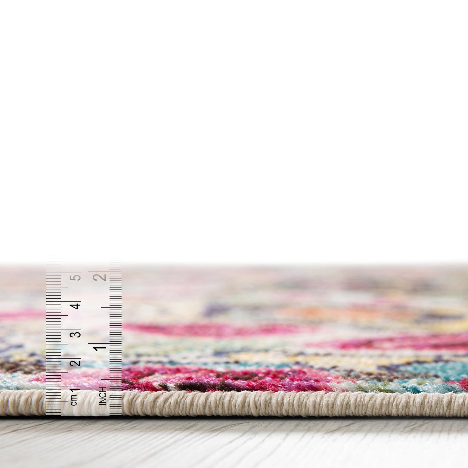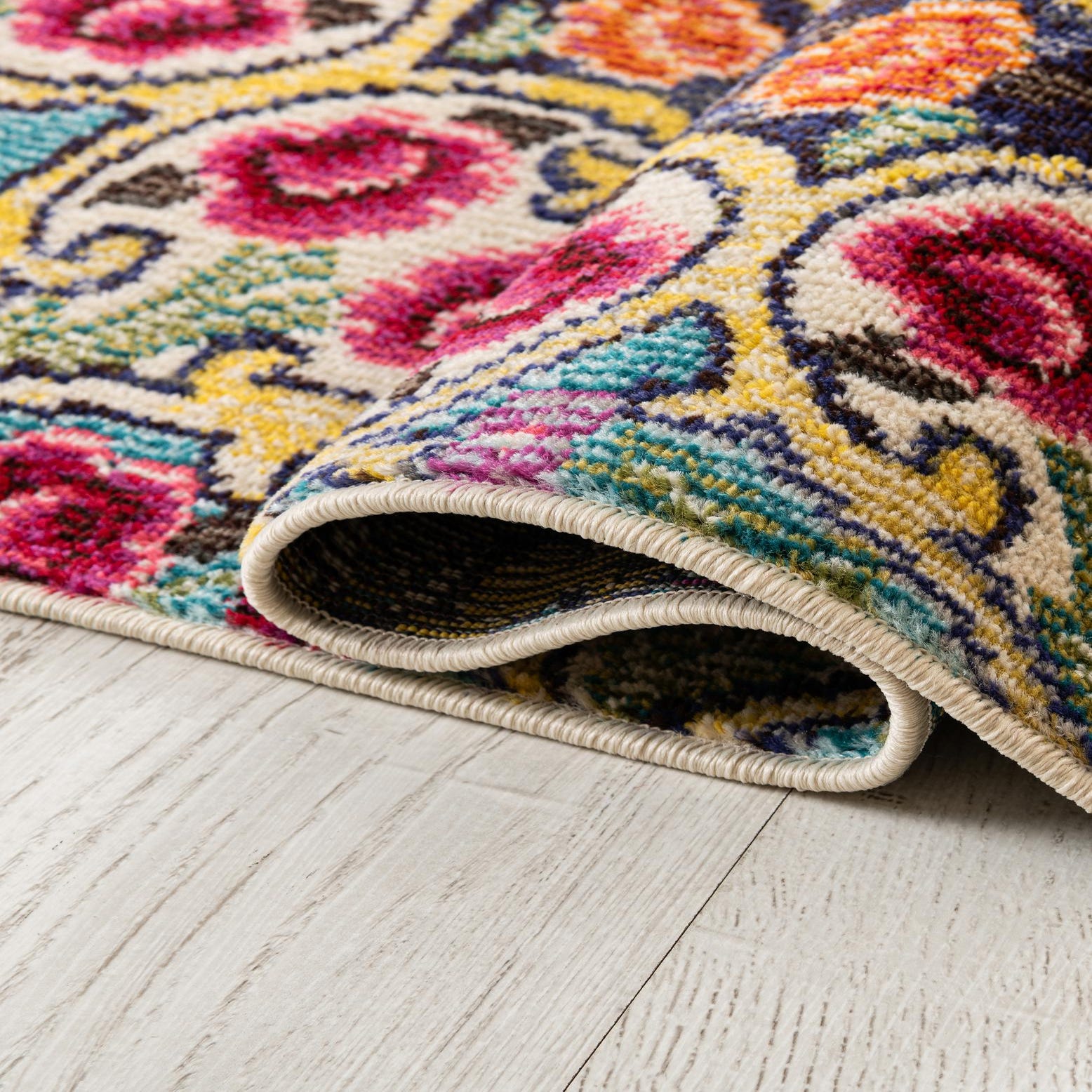 A vibrant runner with a medallion-and-floral motif worked across a multi-colored background. Rich pops of blue, green, ivory, orange, peach, red and yellow form layered floral clusters and geometric outlines that create both movement and symmetry. Machine-made from 100% polypropylene, the rug has a dense, slightly raised pile that offers a soft, textured feel underfoot while keeping the pattern sharply defined.