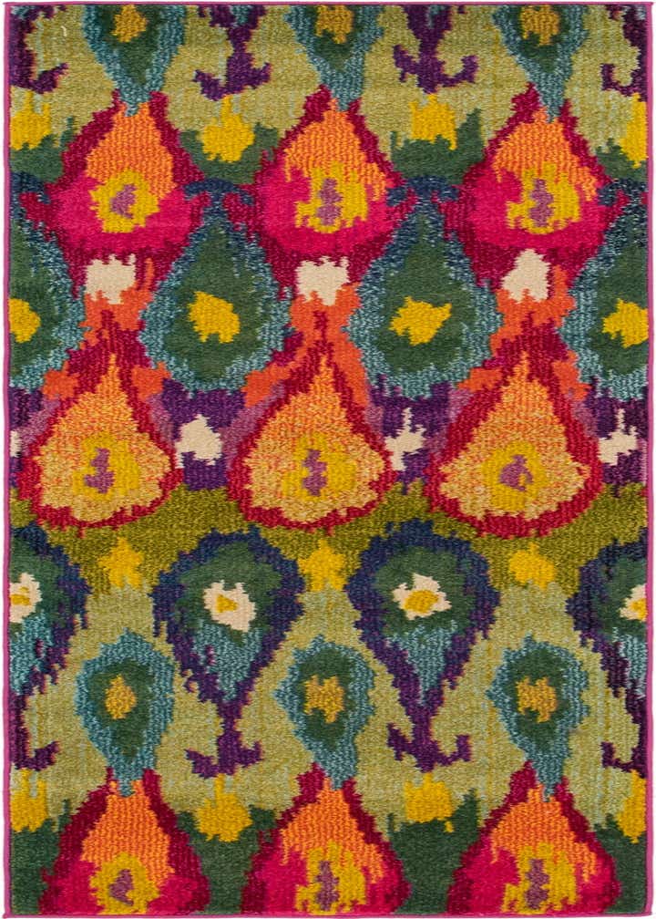 Primary color is Multi. Colors in this rug include: Multi, Blue, Gold, Green, Light Blue, Navy Blue, Orange, Violet, Pink, Yellow.