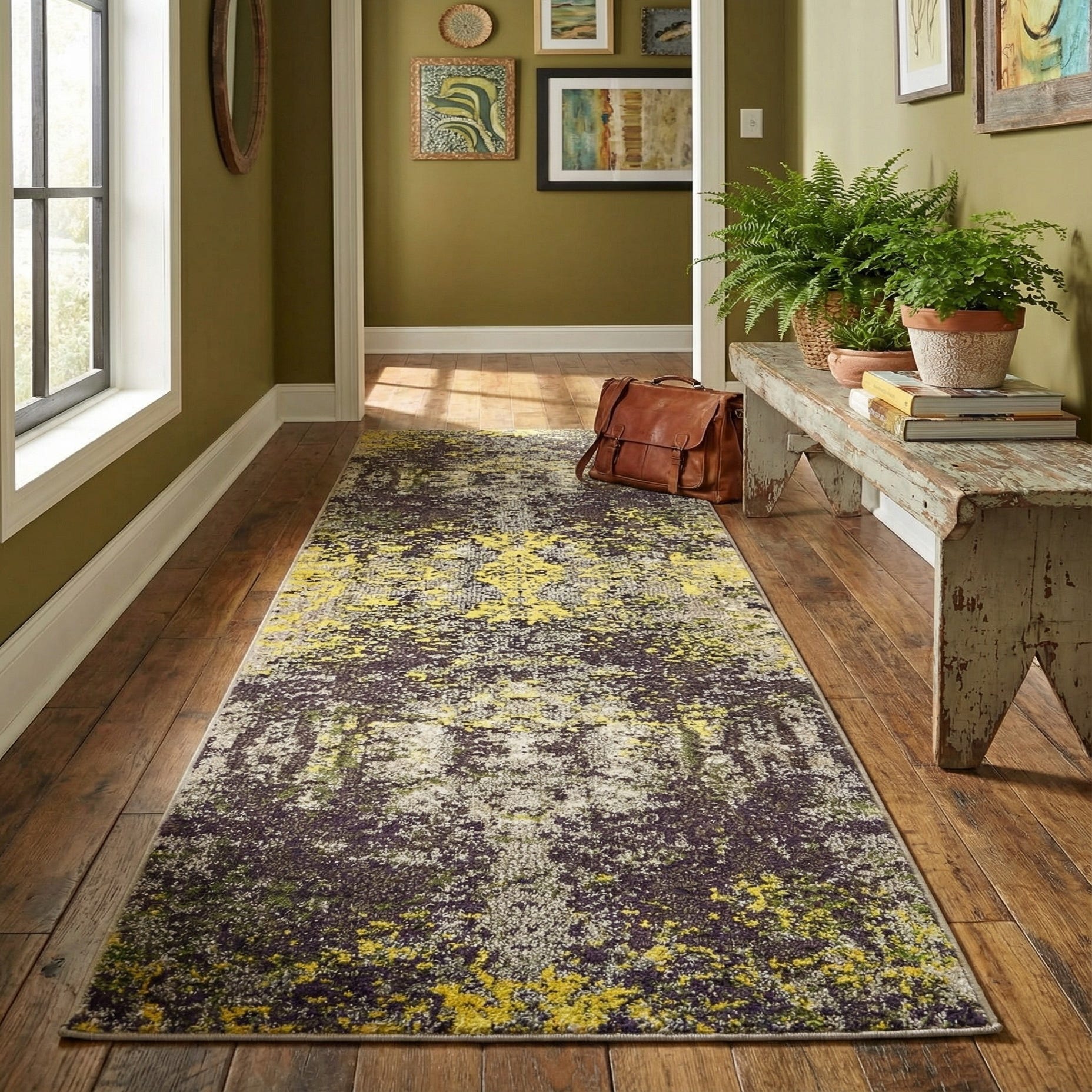 As a runner, it works well in entryways, hallways, or alongside a bed and will anchor narrow traffic paths without overwhelming them. Pair it with warm wood tones and matte black metal accents for an industrial or mid-century modern scheme, or use it to add color and pattern to a neutral, minimalist interior. The rug’s mix of neutrals and color accents also complements transitional spaces that combine traditional furniture silhouettes with contemporary finishes.