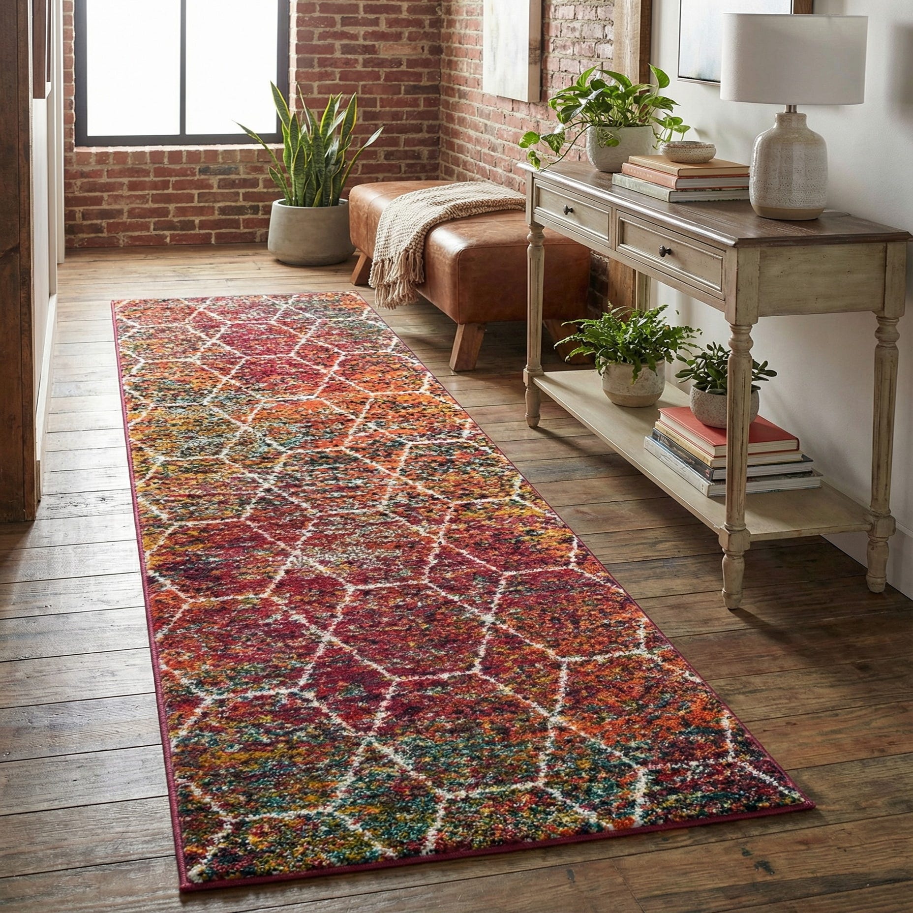 Machine made of 100% polypropylene, this runner brings bold color and visual interest to narrow spaces. Use it to energize a hallway or entry, anchor a long kitchen or mudroom aisle, or add a striking accent along the side of a bed. It pairs well with warm wood and leather furnishings, layered textiles and eclectic decor, and it can also act as a focal stripe in a modern or contemporary scheme that benefits from a playful burst of color.