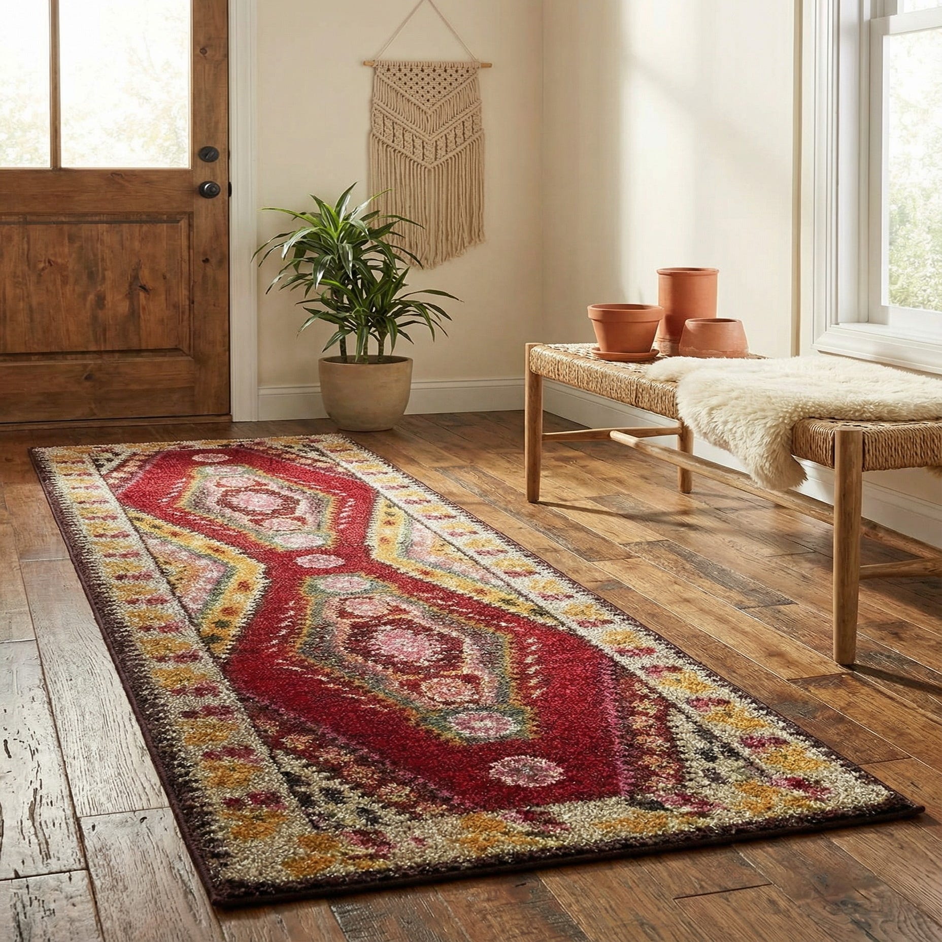 Machine made of 100% polypropylene, the pile has a soft, slightly lustrous hand typical of synthetic constructions, offering clear color saturation and a smooth surface underfoot. Use this runner to anchor a long hallway or entry, line a kitchen or galley, or layer it in front of a sofa to introduce color and pattern without overwhelming a space. It pairs particularly well with warm wood floors, leather or neutral upholstery, and interiors that blend traditional and eclectic elements — think transitional living rooms, boho-inspired corridors, or cottage-style hallways.