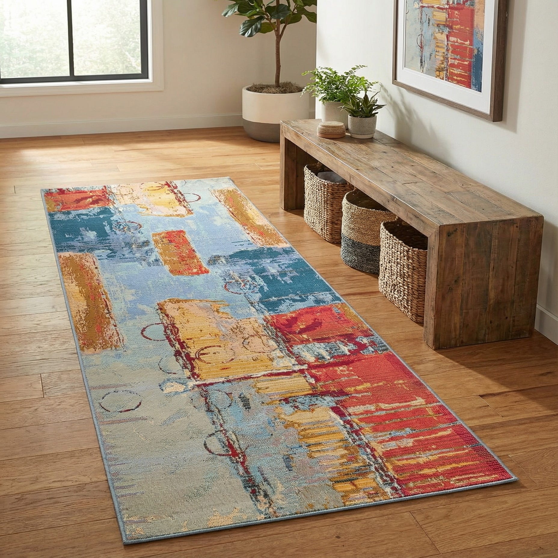 This rug is a fitting complement for contemporary-themed patios, decks, or balconies that benefit from a pop of color and artful character. It could equally serve well in entryways, hallways, or kitchens where a durable yet decorative floor covering is desired. It would pair beautifully with minimalist furnishings to add a touch of flair or could easily integrate into a more eclectic decor scheme thanks to its multitude of hues.