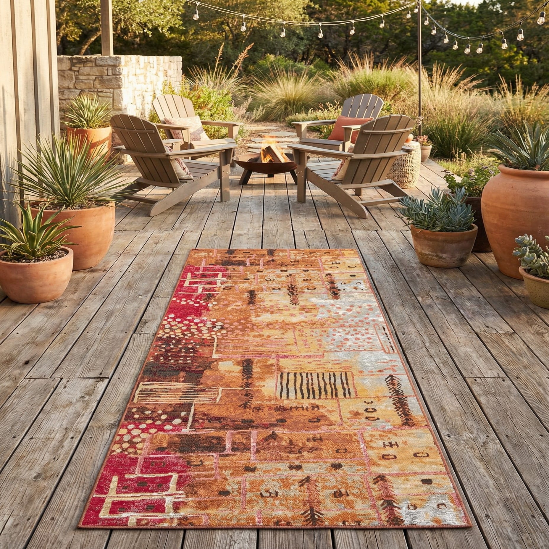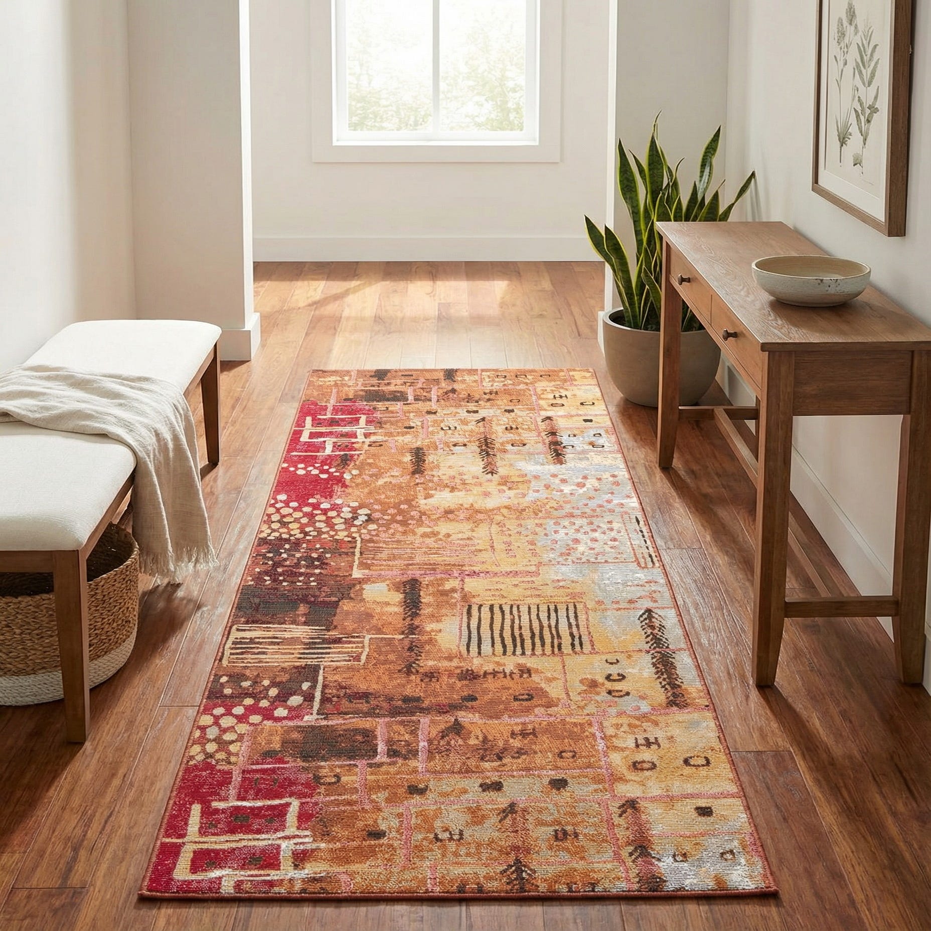 This runner fits well in high-traffic hallways, entryways or indoor-outdoor transition areas, and it anchors narrow kitchen or balcony layouts with confident color and pattern. Pair it with warm wood furniture and woven seating for a casual, layered look, or combine it with matte metal accents and simple upholstery to add visual interest to contemporary and eclectic interiors.