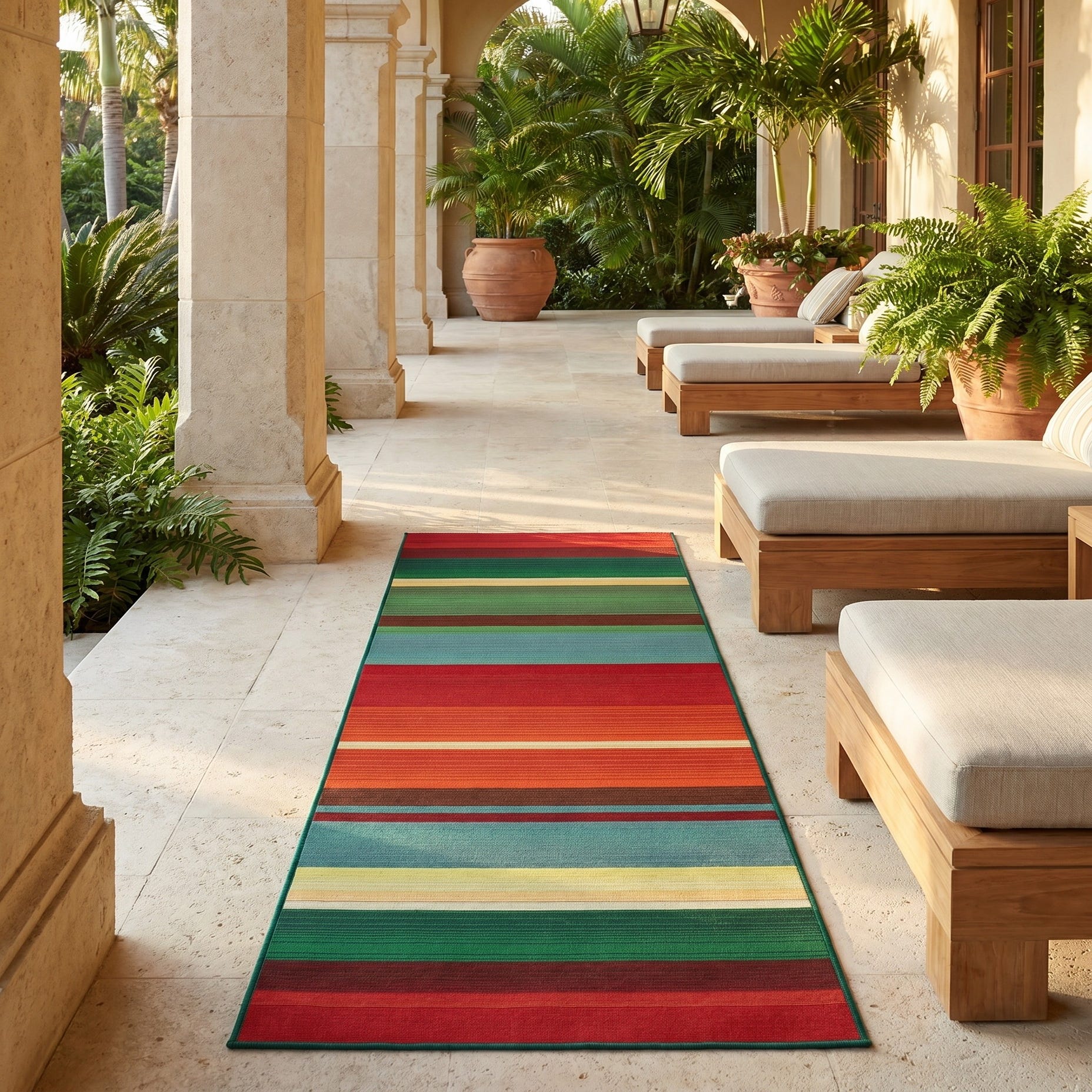 Fell in love with this rug when I saw it on-line for its delightful pattern and vivid colors. It arrived in two days from the day ordered about a week ago. We put it down on our renovated deck today...it is even more awesome than we thought it would be! The colors and pattern outset the colors of the deck perfectly.