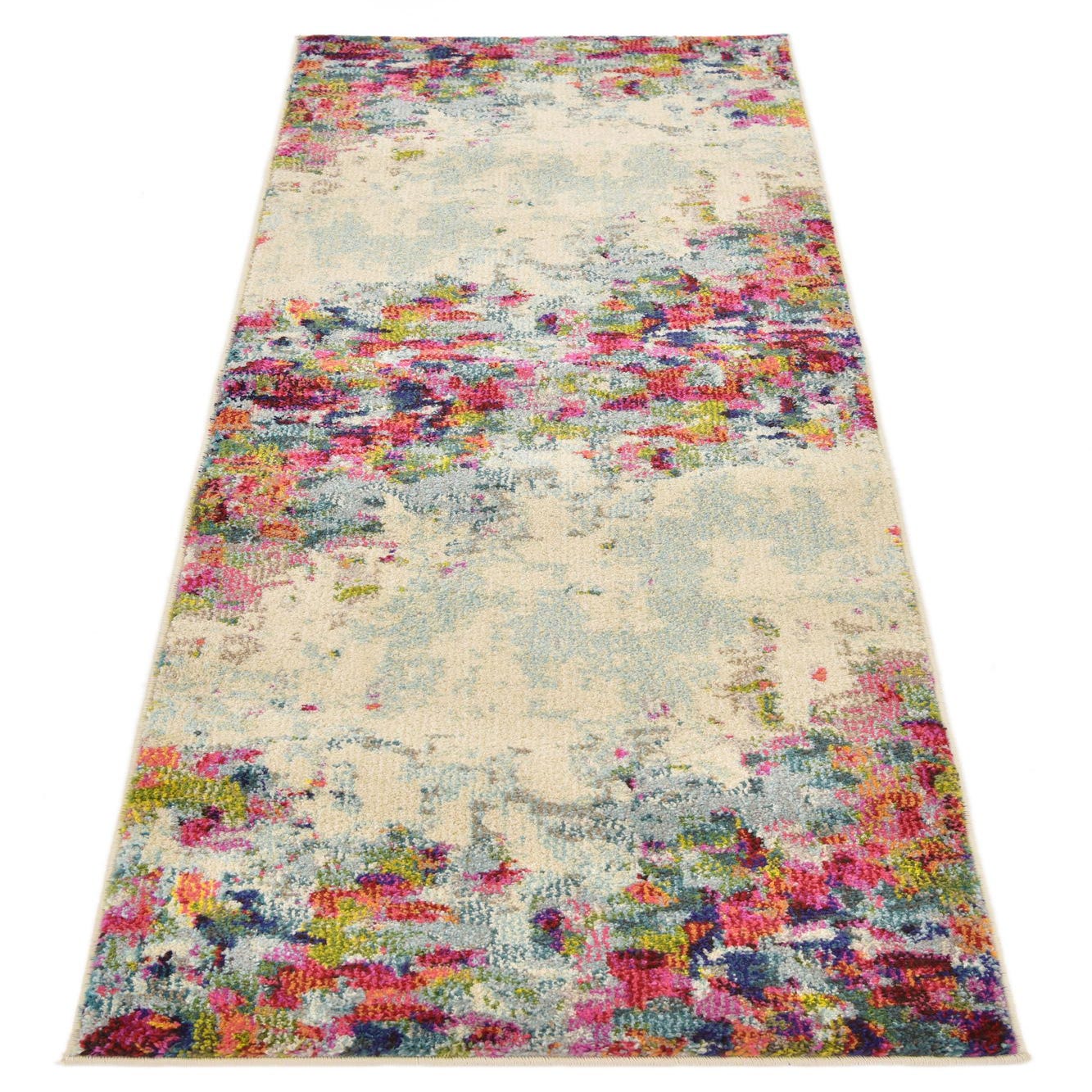 As a runner, this piece brings color and energy to narrow spaces: try it in an entryway or hallway to guide the eye, alongside a kitchen island to anchor foot traffic, or layered under a console table to punch up a neutral vignette. Its bold palette pairs well with contemporary, bohemian, or eclectic interiors and can act as the focal point against simple furnishings or complement patterned throw pillows and artwork for a richer layered look.