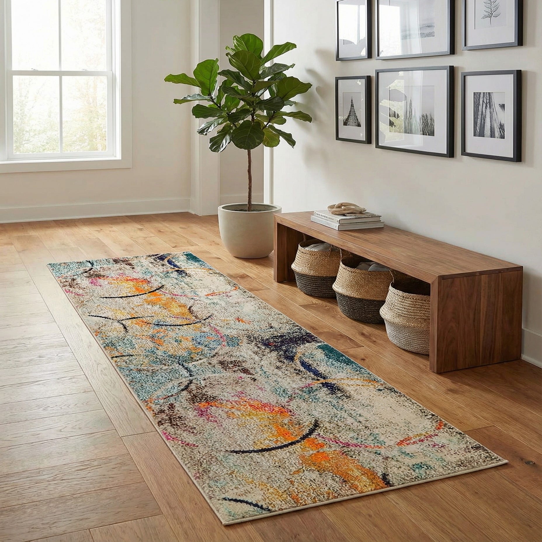 A 7 ft runner rug with a vibrant, multi-colored abstract pattern featuring teal, orange, pink, and dark blue on a light background, ideal for a hallway.