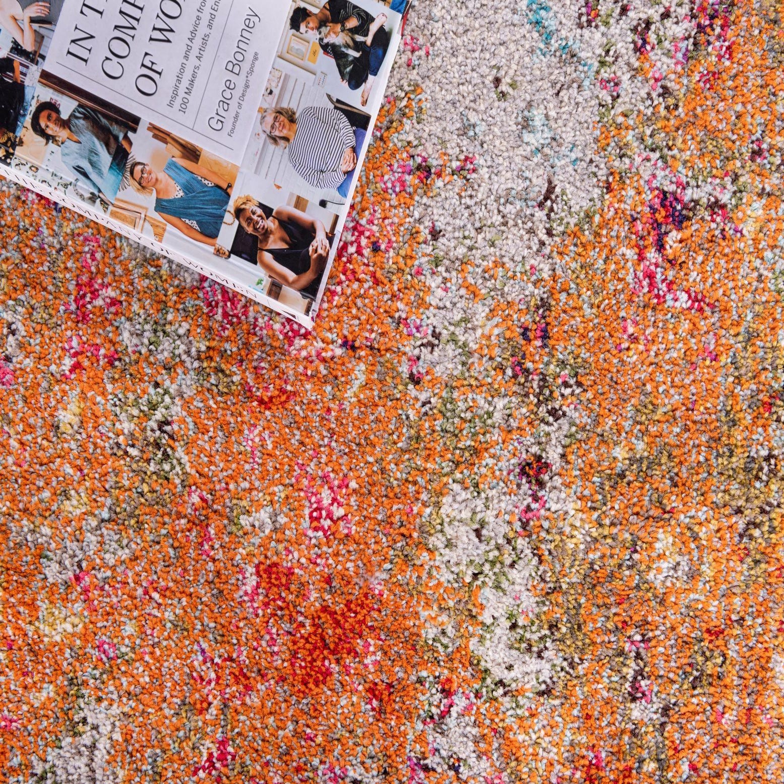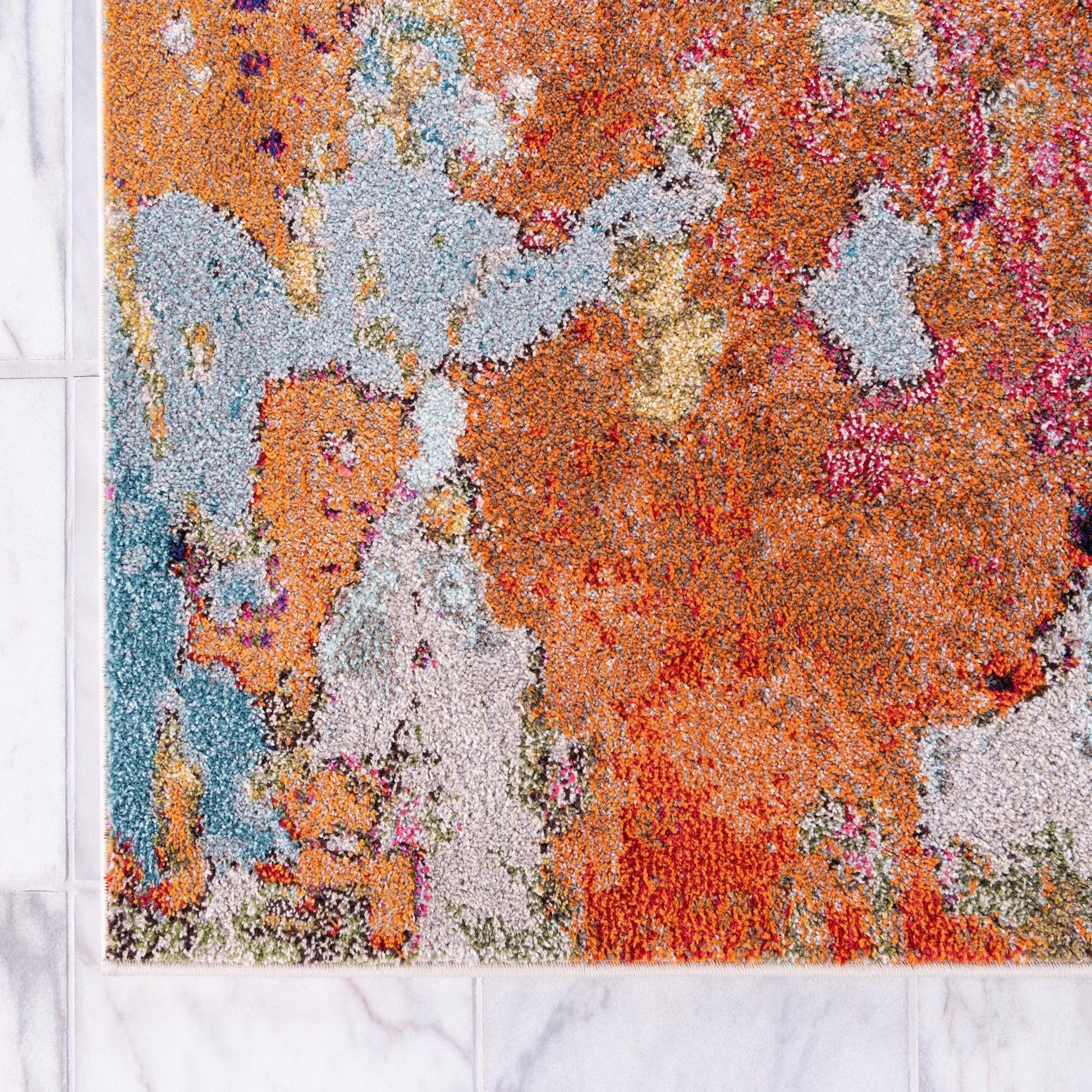 A painterly, abstract pattern spreads across a multi-background field, where warm golds and oranges mingle with pops of pink, red and purple, while cooler notes of blue, navy and green thread through the composition. The design has a relaxed, artful quality—areas of concentrated color fade into textured, beige-tinted sections to create visual depth and movement. Machine-made from 100% polypropylene, the rug has a low-to-medium pile with a slightly dense hand that holds color well and delivers a soft underfoot feel without excess loft.