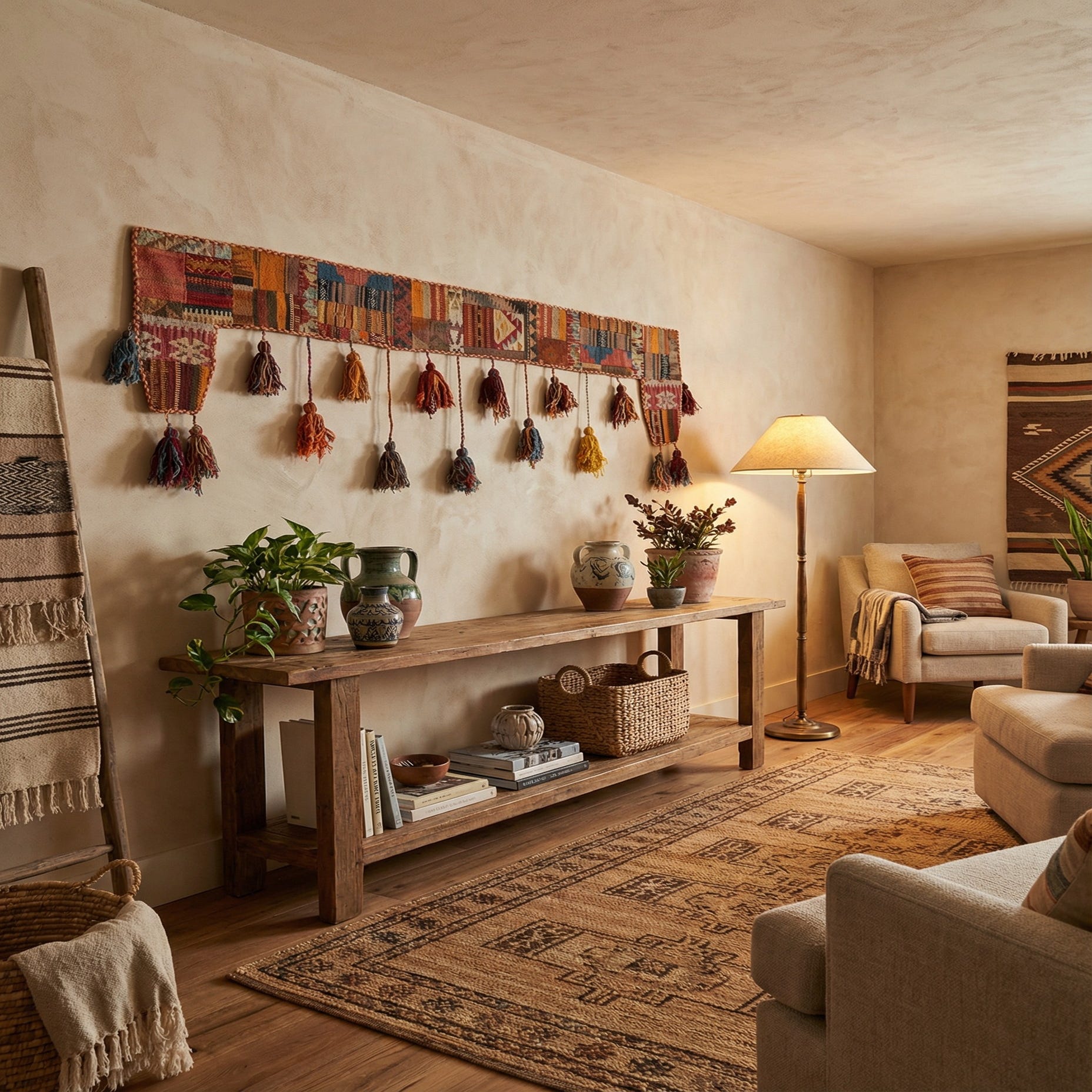 Accentuated by a pattern that is characteristically eclectic, featuring a tapestry of geometric motifs, this piece embodies a bohemian spirit. The inclusion of fringe on the edges adds a traditional touch, echoing the authenticity of its craft.