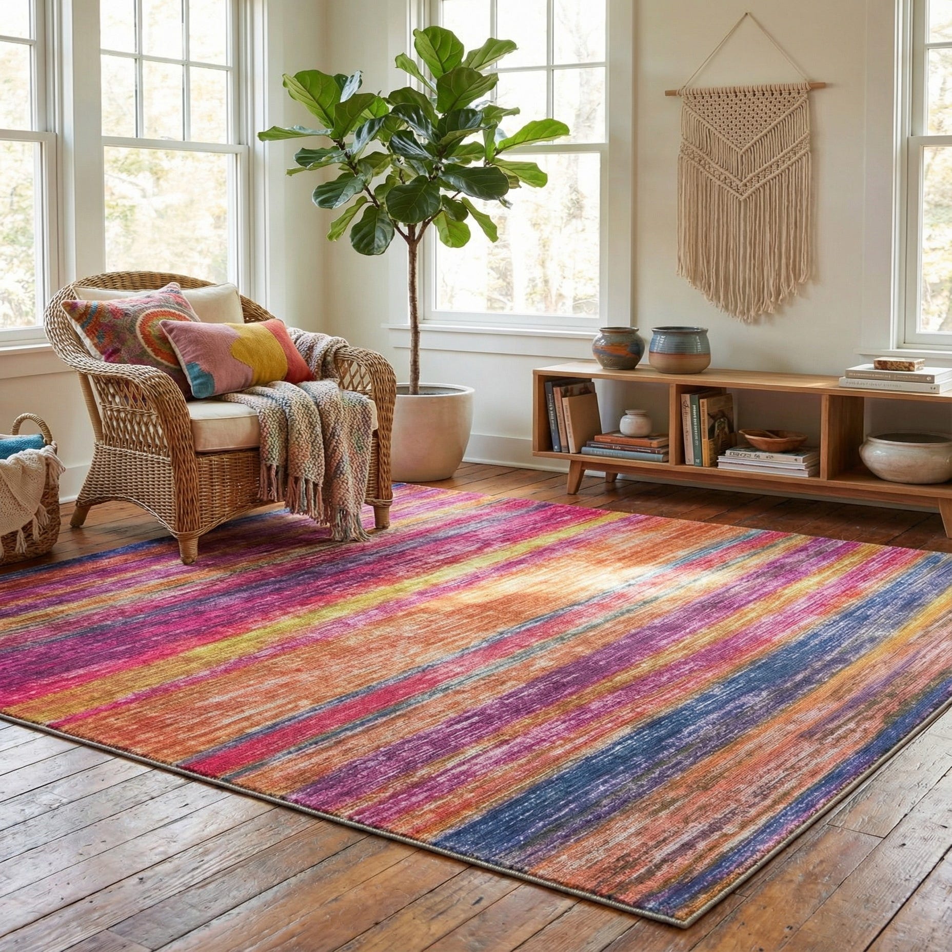This stain-resistant and pet-friendly rug boasts flatweave construction, ensuring both durability and a shed-free experience, making it an ideal choice for high-traffic areas and households with pets. Its blend of colors and sleek design seamlessly integrates with a variety of interior designs, from modern and eclectic to bohemian spaces. Given its size and square shape, this rug can anchor a small sitting area, underpin a compact dining set, or serve as a distinctive statement in an open floor plan. With its unique mix of hues, the Asha rug can tie in various color schemes within a room or provide a contrasting pop against a more neutral decor palette.