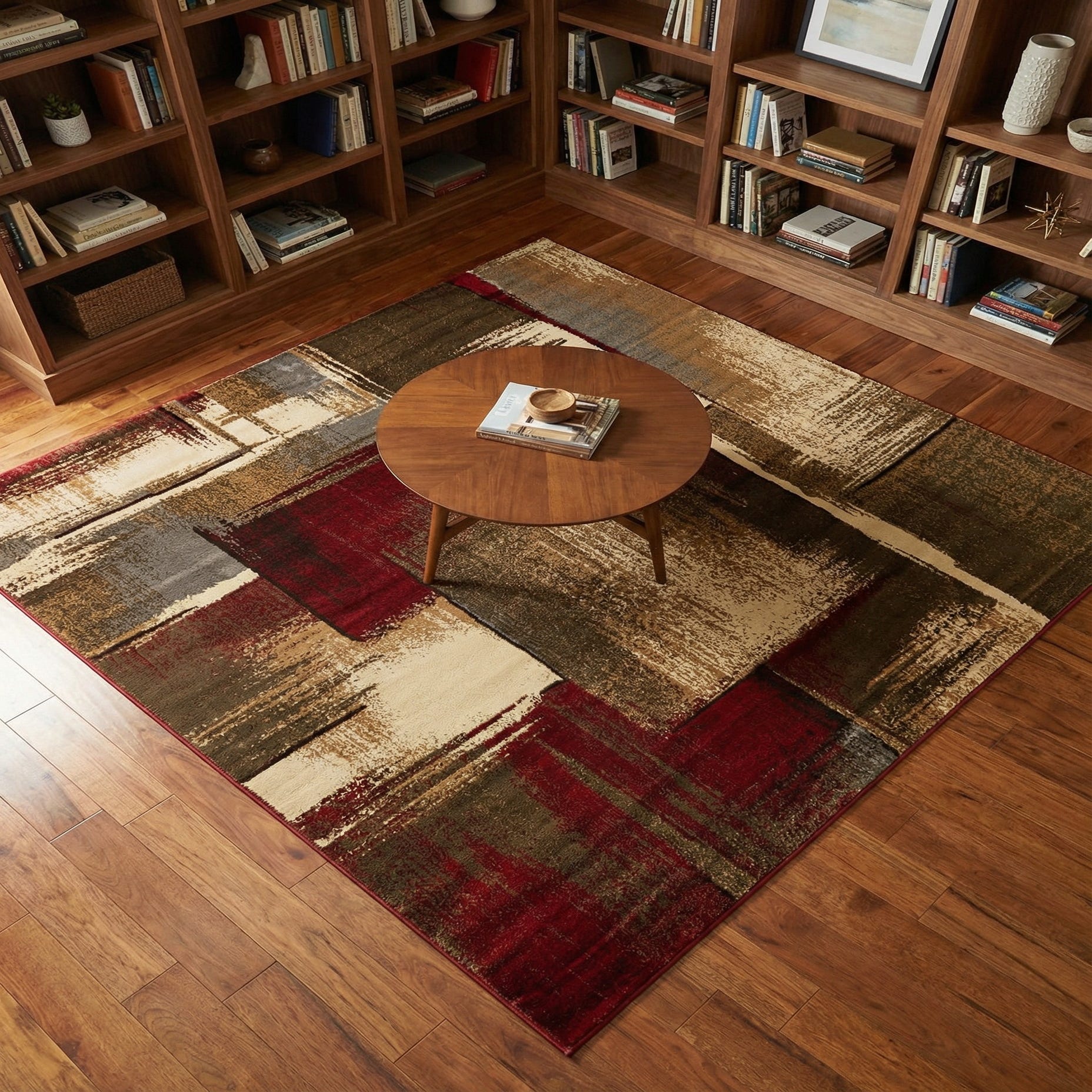 This piece suits contemporary and transitional interiors—place it beneath a sofa and coffee table to ground a living area, or use it in a home office or den to add color and visual interest without overpowering the room. It pairs well with warm wood furniture, leather seating, charcoal or navy upholstery, and mixed-metal accents in industrial or modern-rustic schemes.