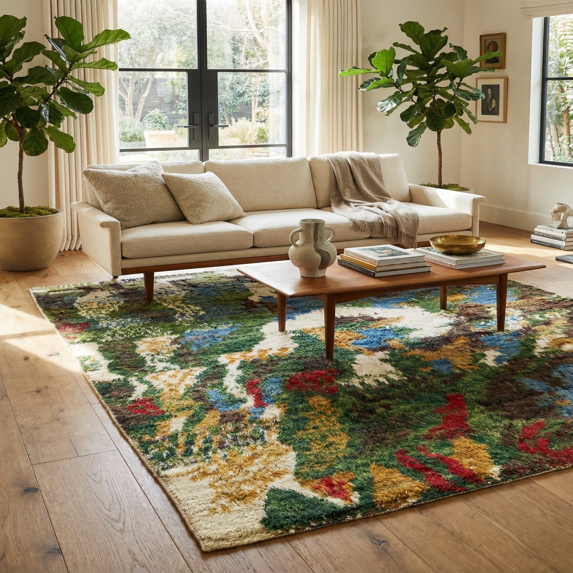 A 5' 10 x 7' 5 square multi-colored wool rug featuring an abstract, modern pattern with shades of green, blue, brown, red, and cream.