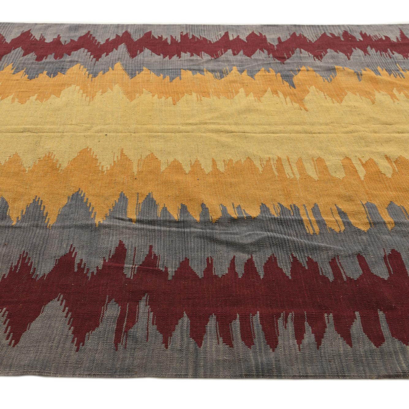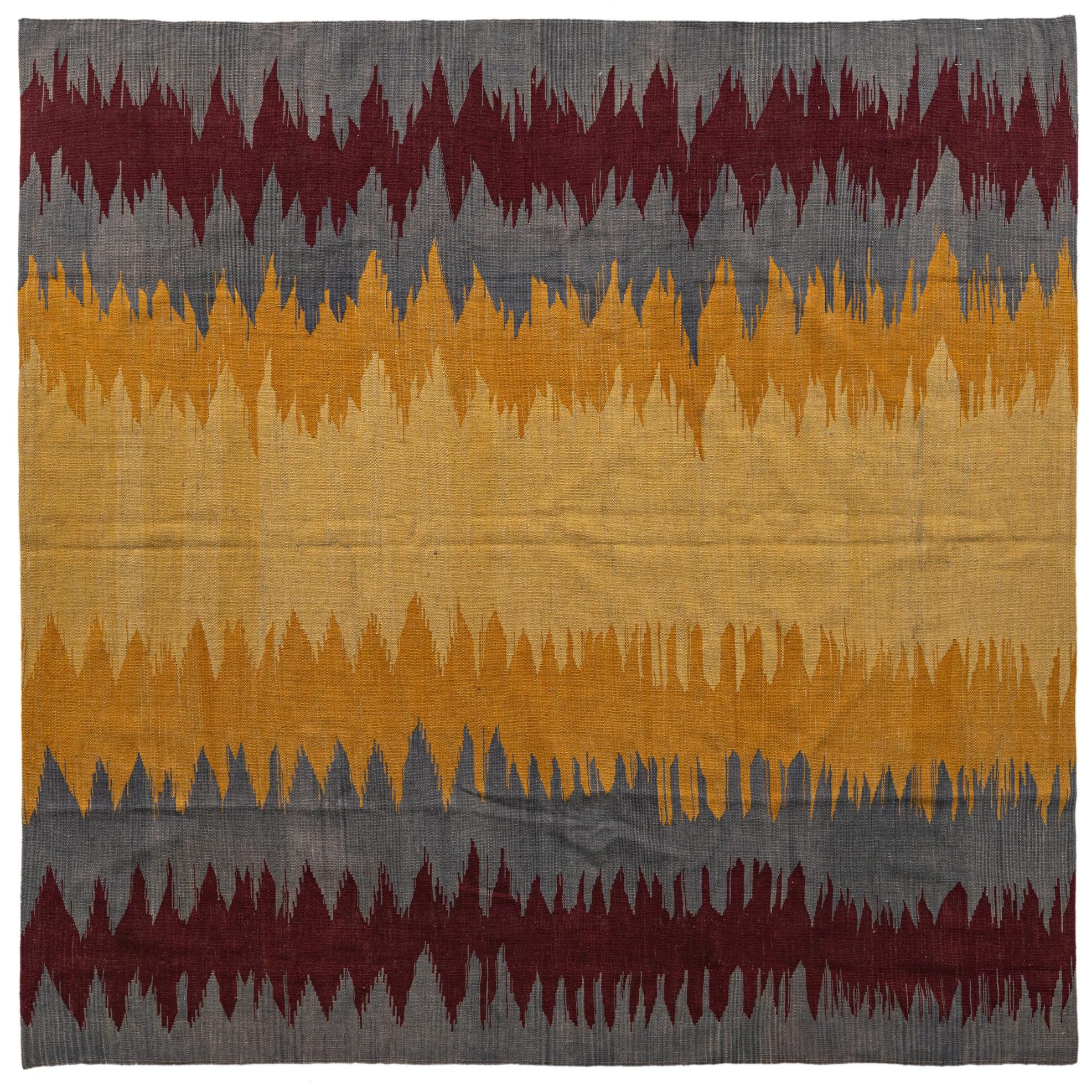 This Kilim Modern collection rug is handwoven from 100% wool and presents a distinctive geometric pattern reminiscent of tribal designs. The 7-foot square rug features a bold, graphical display of peaks and valleys in a dynamic array of colors, including gray, yellow, and burgundy against a multi-colored background. Its flatweave texture offers a durable, low-profile surface that can easily accommodate furniture and high-traffic areas.