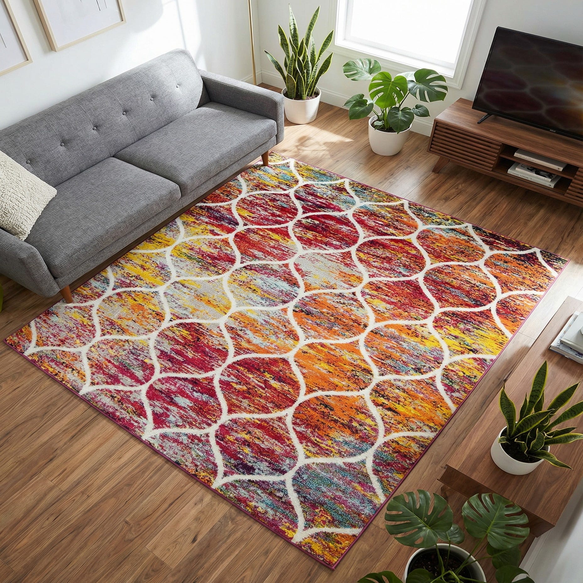 A vibrant geometric motif takes center stage with a repeating ogee-lantern lattice set against a multicolored ground. Each medallion is filled with a painterly mix of black, blue, brown, green, orange, purple, red and pink, producing a layered, brushed effect that gives the surface depth and movement while the light lattice lines provide crisp definition. The overall look balances bold color with a structured pattern, lending both energy and rhythm to a room.