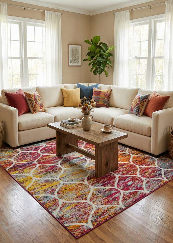 Machine made of 100% polypropylene, the rug offers a smooth, low-profile texture that layers easily beneath seating or a dining table. It pairs naturally with neutral sofas and clean-lined modern furnishings to introduce color without overwhelming the scheme, and it also complements eclectic, bohemian interiors with warm woods, woven accents and mixed textiles. Use it to anchor a living area, add personality to a home office, or bring a lively focal point to an entry or playroom.