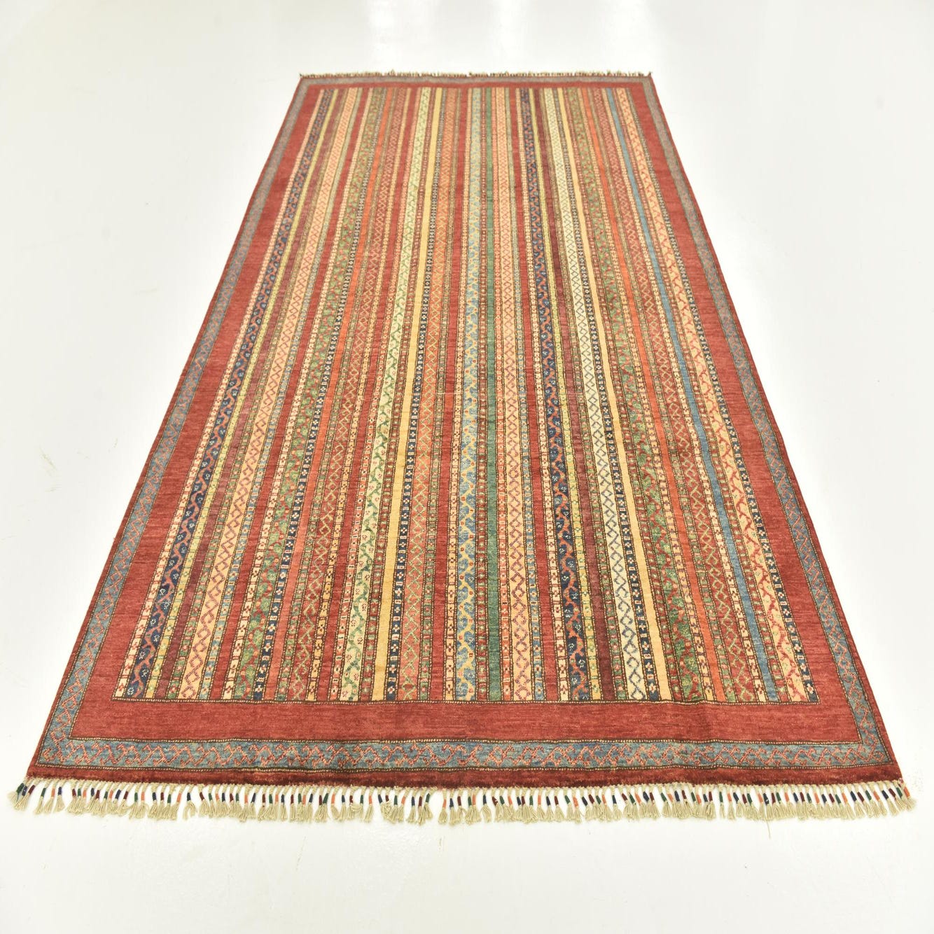 7x10 rectangular Ariana Ziegler rug with multi-colored traditional striped patterns and a red border, handmade from wool.