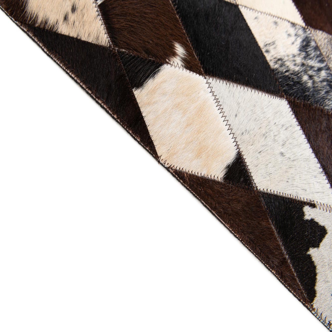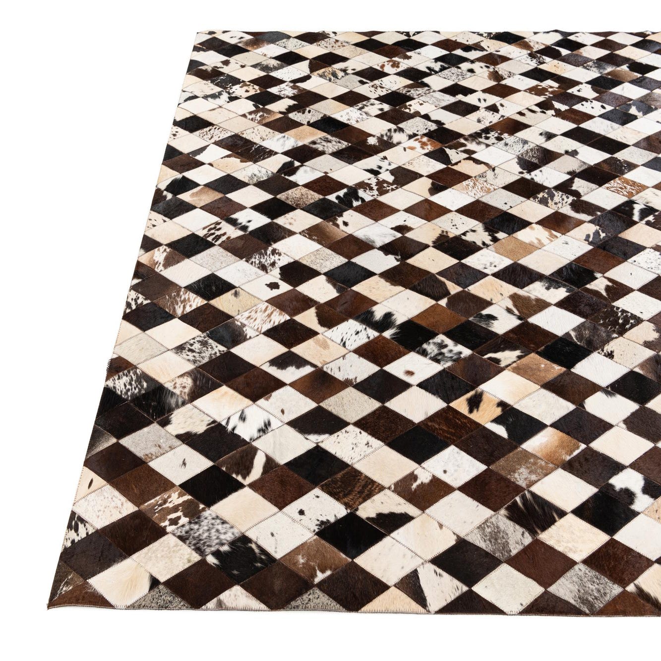 A 7x10 rectangular Cowhide Stocks rug featuring a modern harlequin pattern of multi-colored cowhide and leather diamond patches in various natural shades.