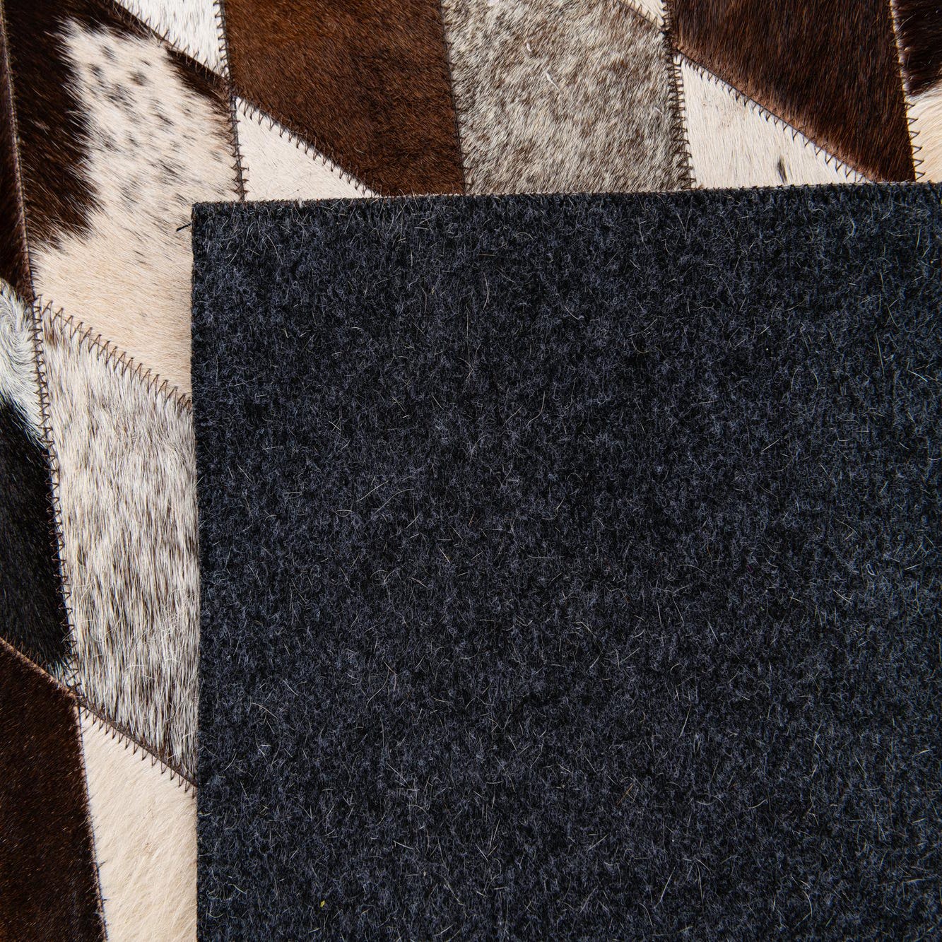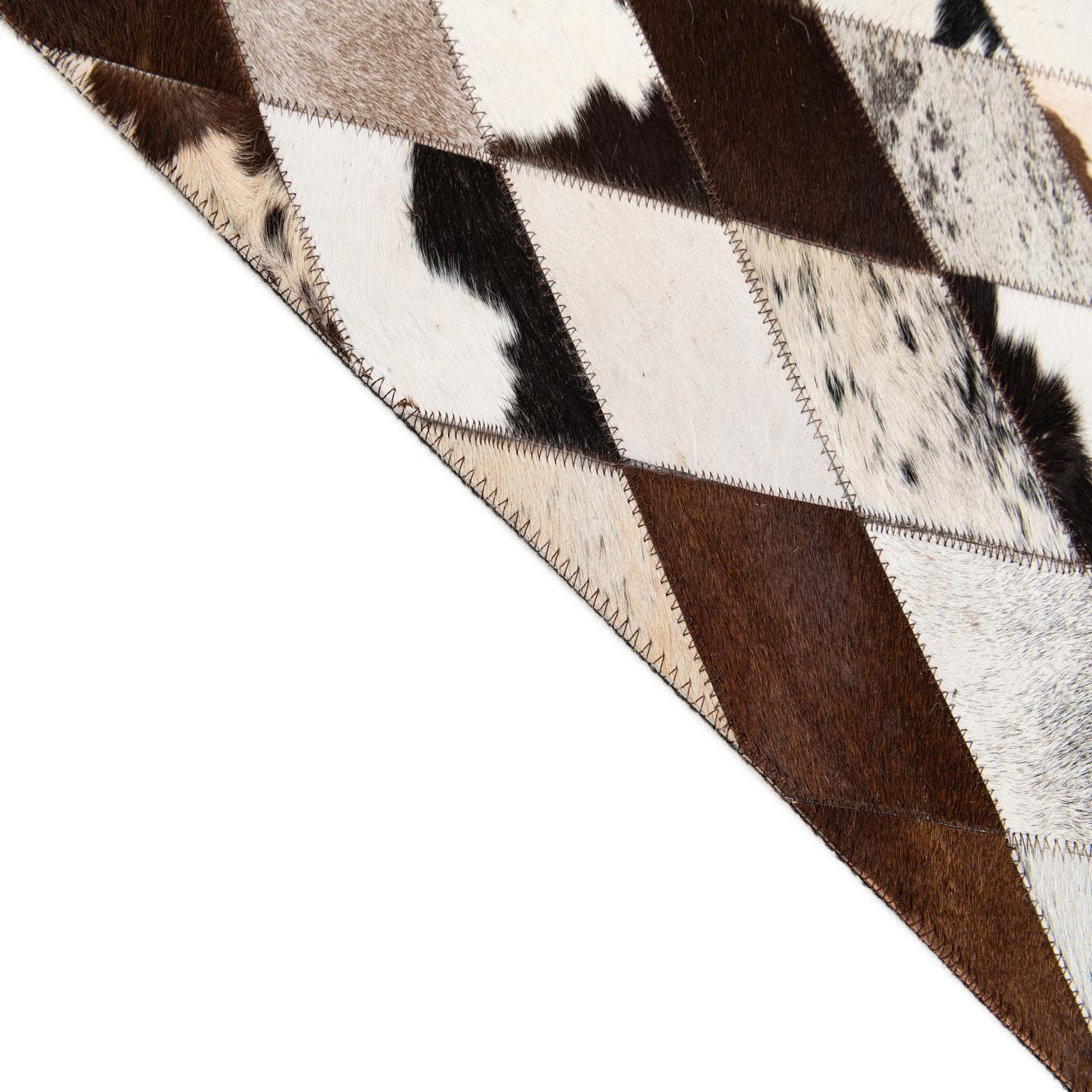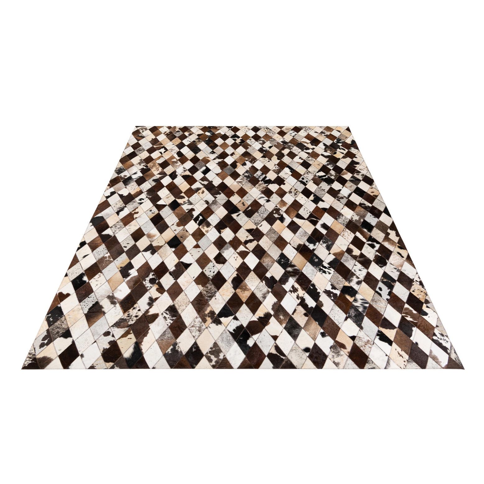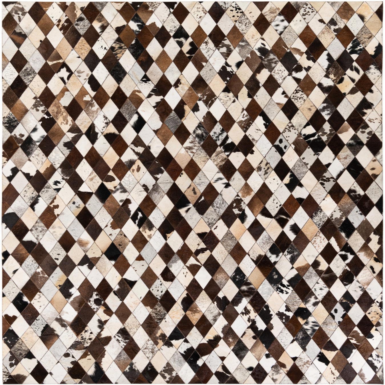 Handmade of cowhide and leather, this rug arranges small diamond patches into a tight harlequin pattern in a multi background of beige, tan, light brown, brown, ivory and black. Each diamond combines solid and naturally patterned hides, creating a mosaic of speckled and uniform tones that catch light differently across the surface. The hair-on-hide texture is soft to the touch with a low nap and gentle sheen, while the stitched leather seams add a subtle linear definition and tactile contrast.
