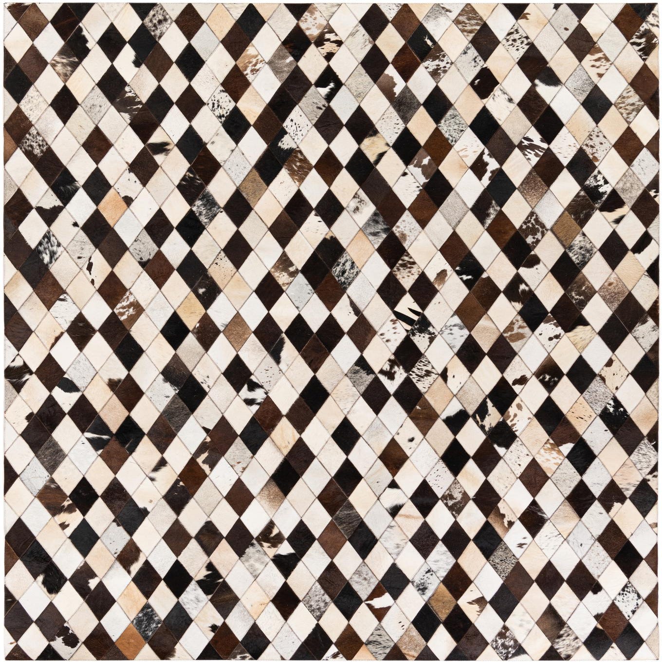 A 7x10 rectangular multi-colored cowhide rug featuring a modern diamond pattern in various shades of brown, black, and white.