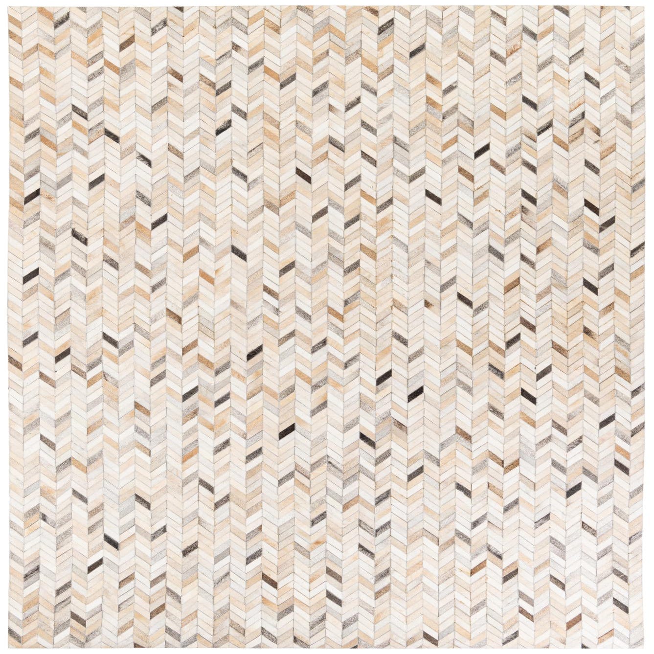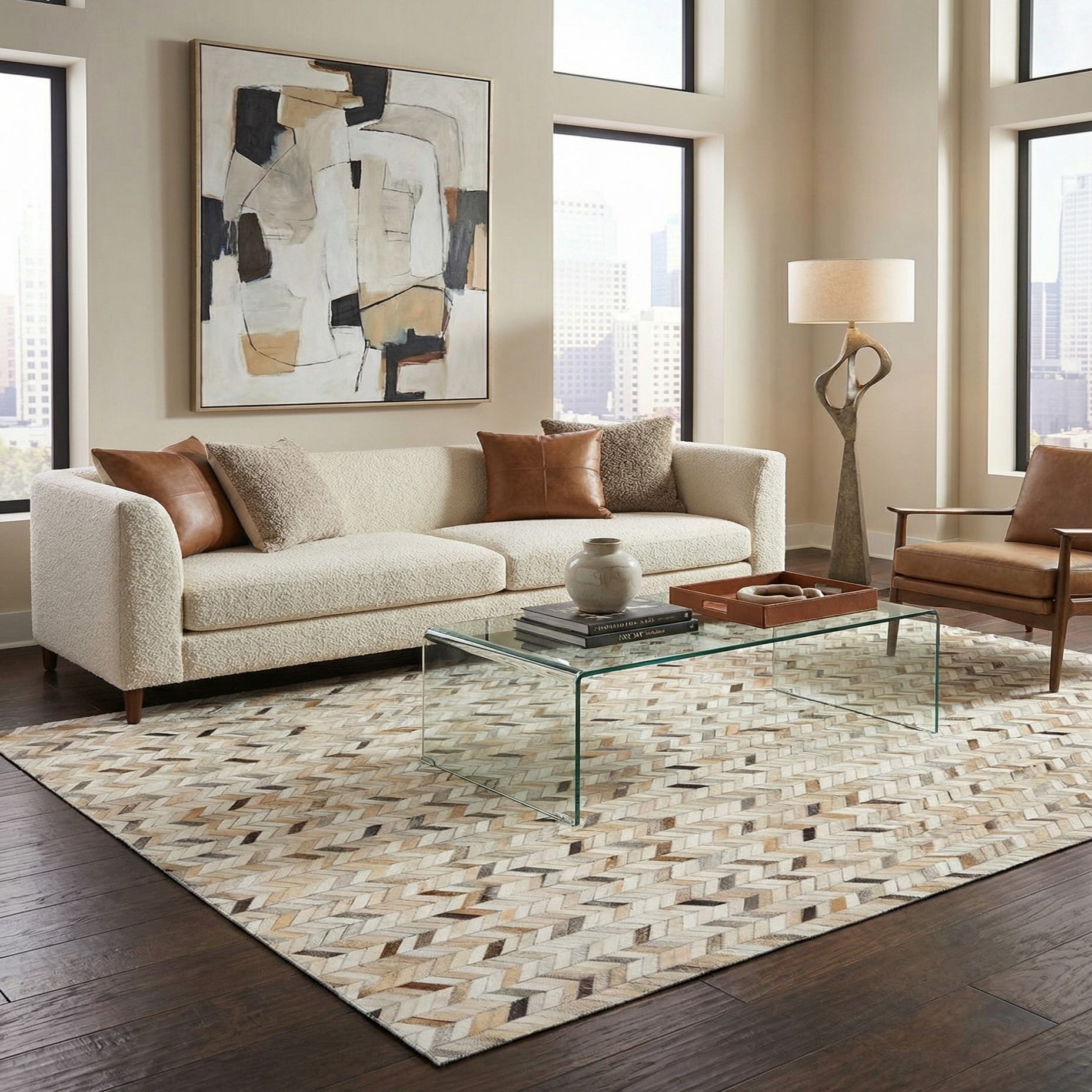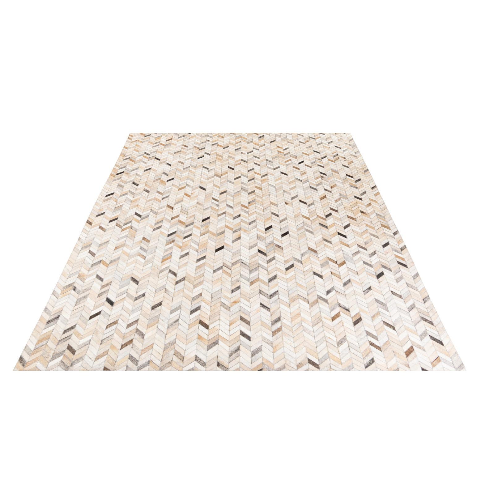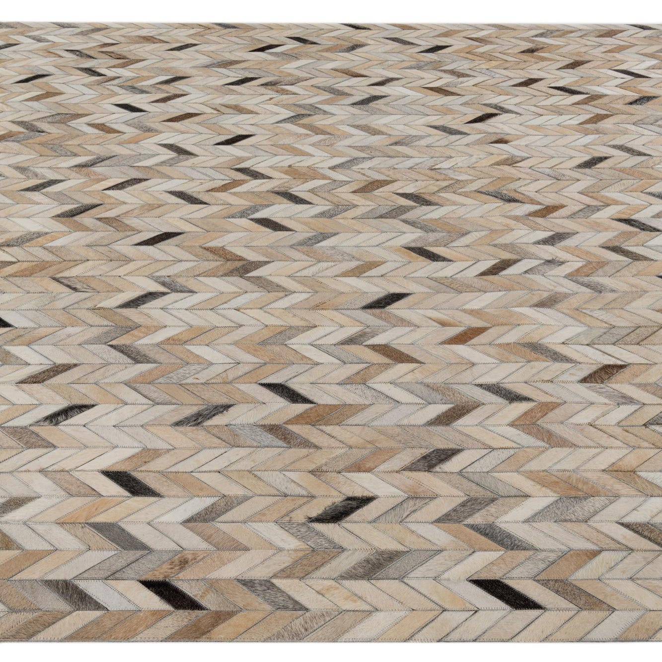 A rectangular 7x10 multi-colored cowhide rug featuring a modern chevron pattern in various shades of brown, beige, and cream.