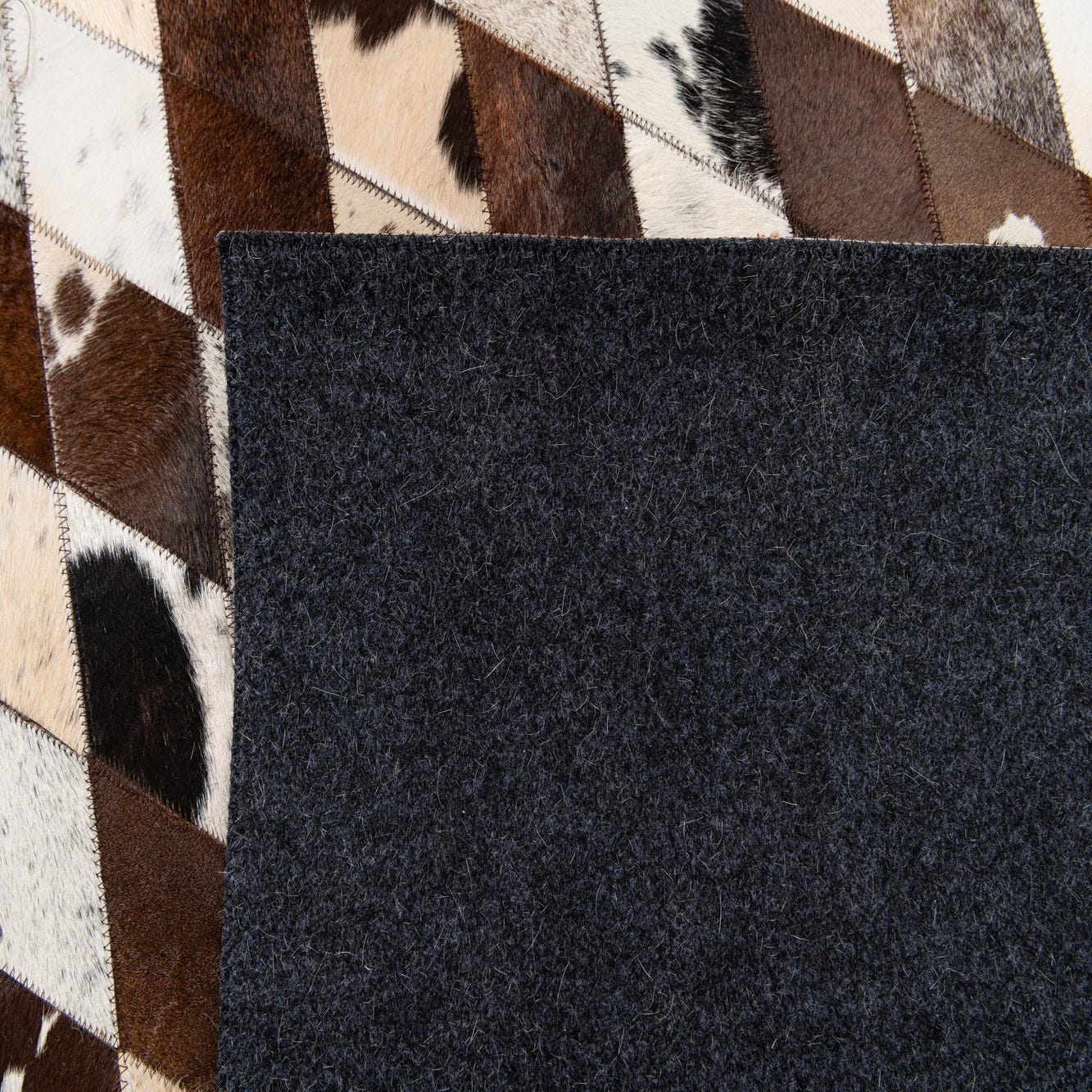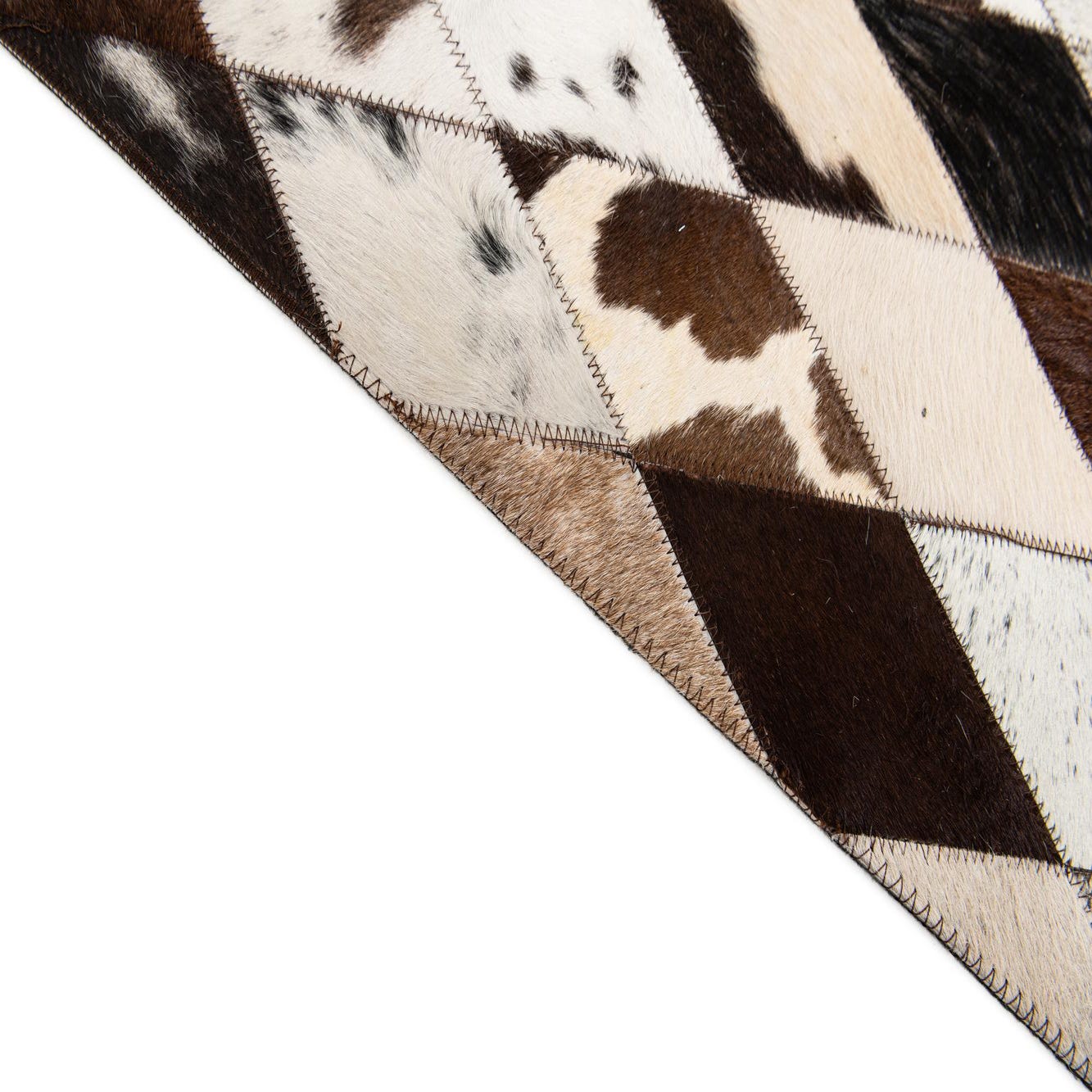A 7x10 rectangular Cowhide Stocks rug featuring a modern diamond pattern in multi-colored brown, white, and black cowhide patches.
