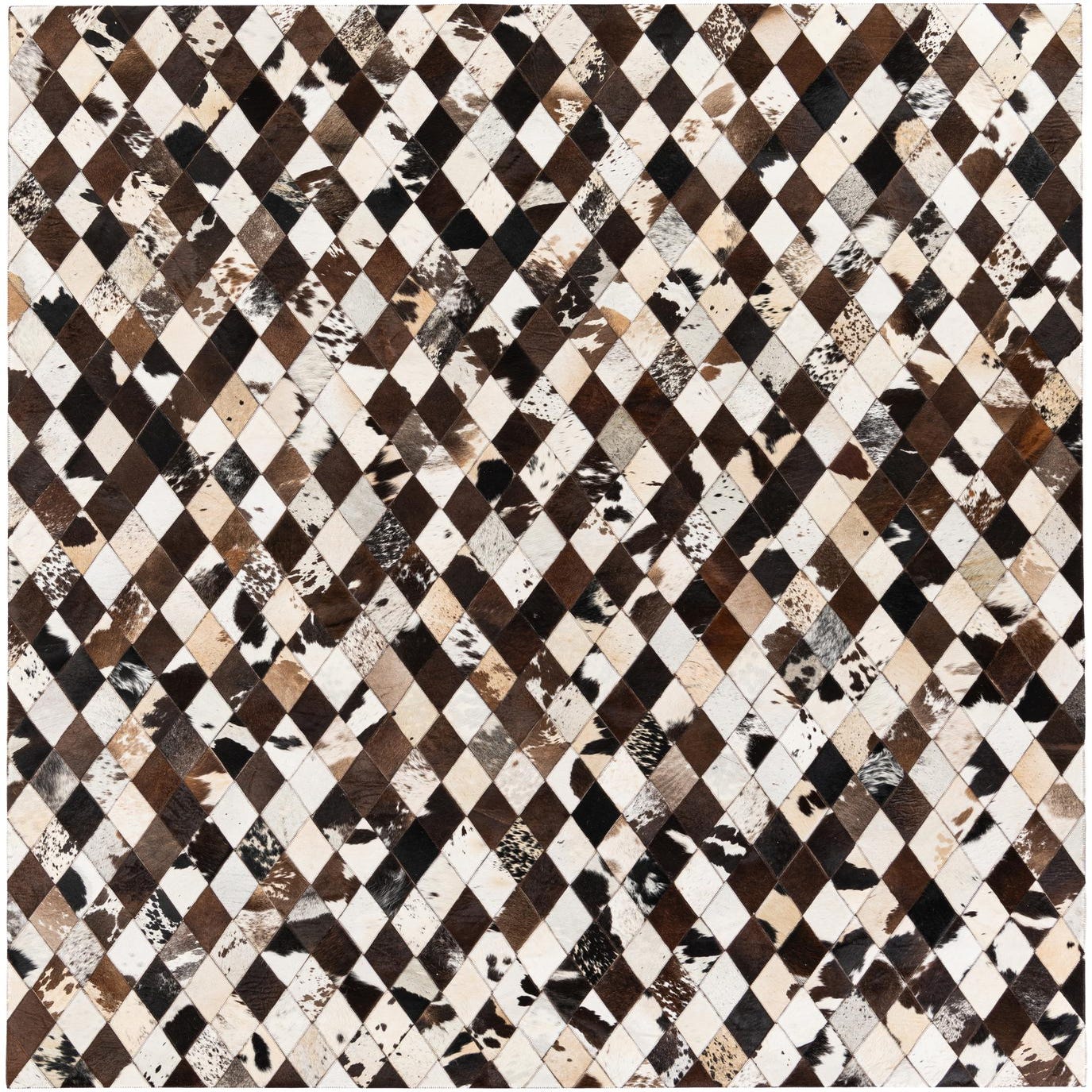 A 7x10 rectangular Cowhide Stocks rug featuring a modern diamond pattern in multi-colored natural cowhide patches.