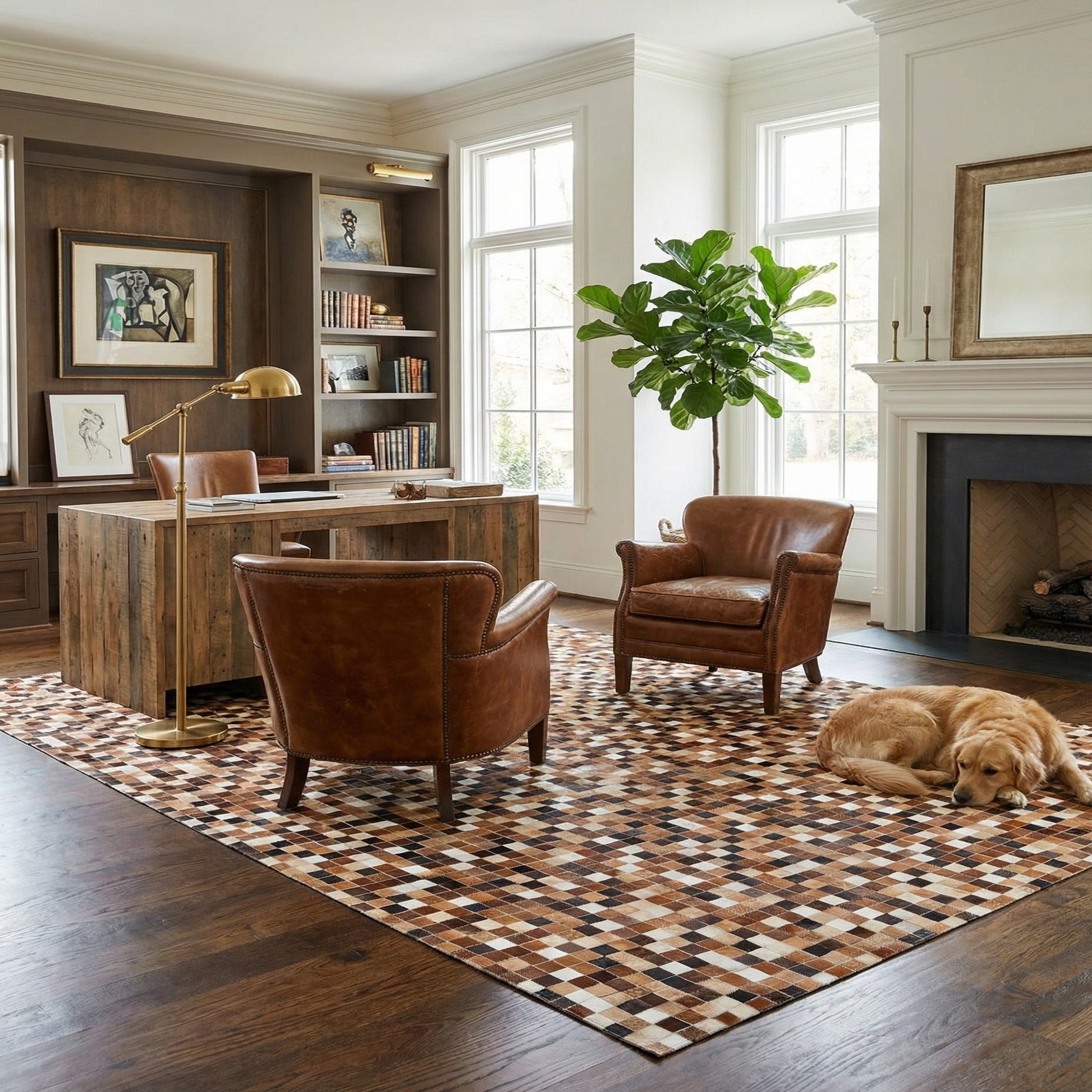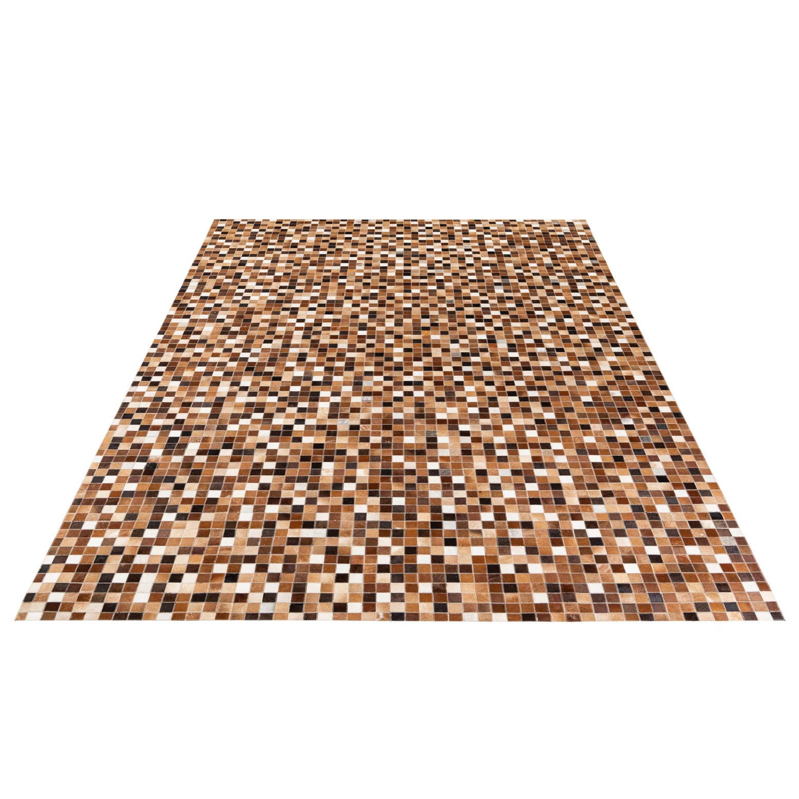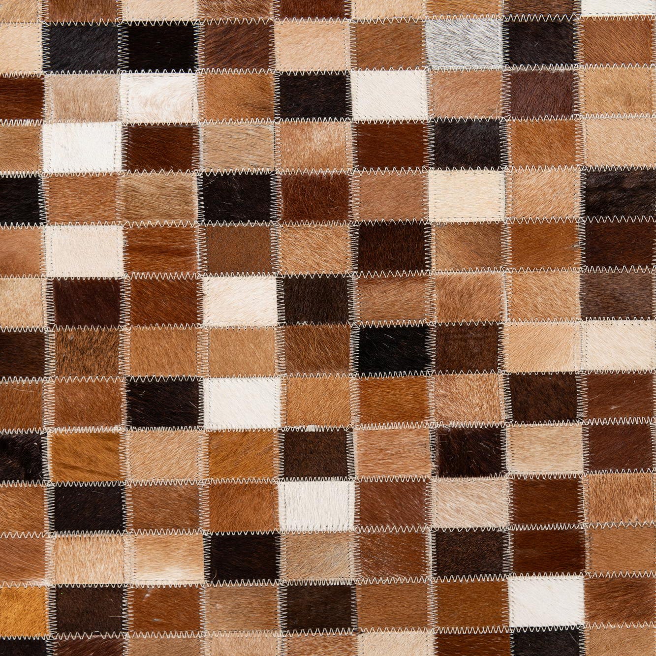 A 7x10 rectangular Cowhide Stocks rug featuring a modern mosaic pattern of multi-colored cowhide and leather squares in various shades of brown, black, and white.