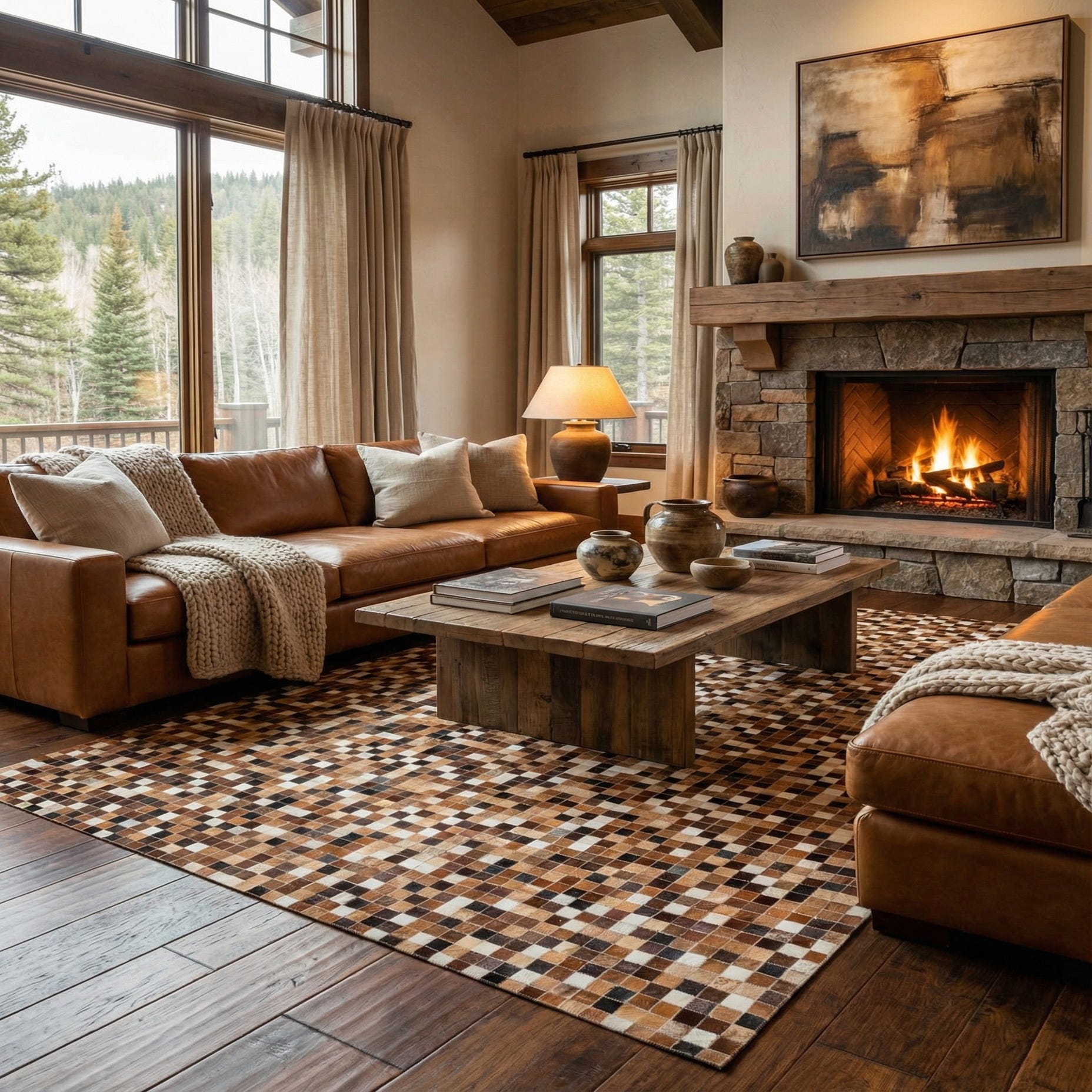 A 7x10 rectangular modern rug featuring a mosaic pattern of small squares in varying shades of brown, black, and white cowhide.